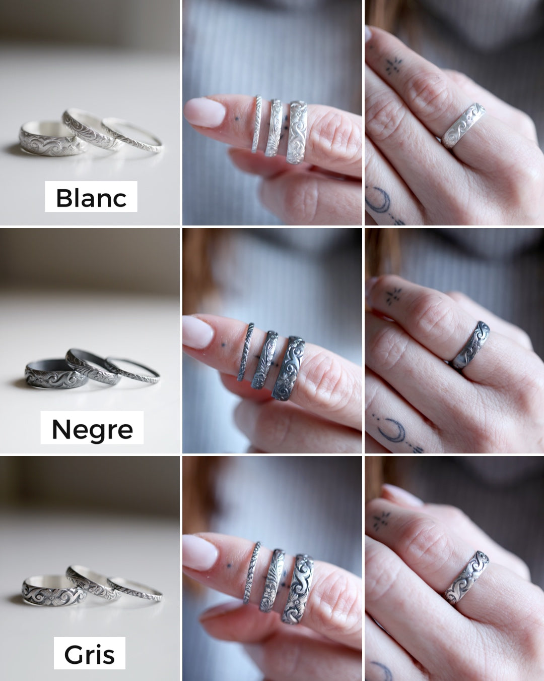 Acabat: Puc fer l'anell en tres acabats; blanc, negre (plata oxidada) i gris (plata oxidada esmerilada). Pots escollir l'acabat que t'agradi més, si no em dius el contrari jo enviaré l'anell amb acabat gris.