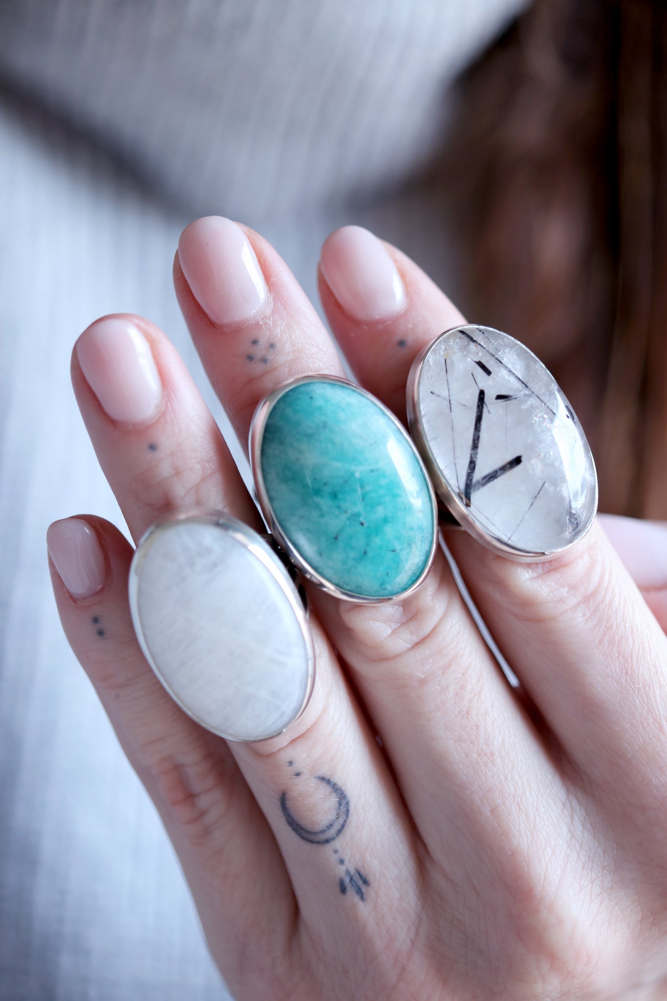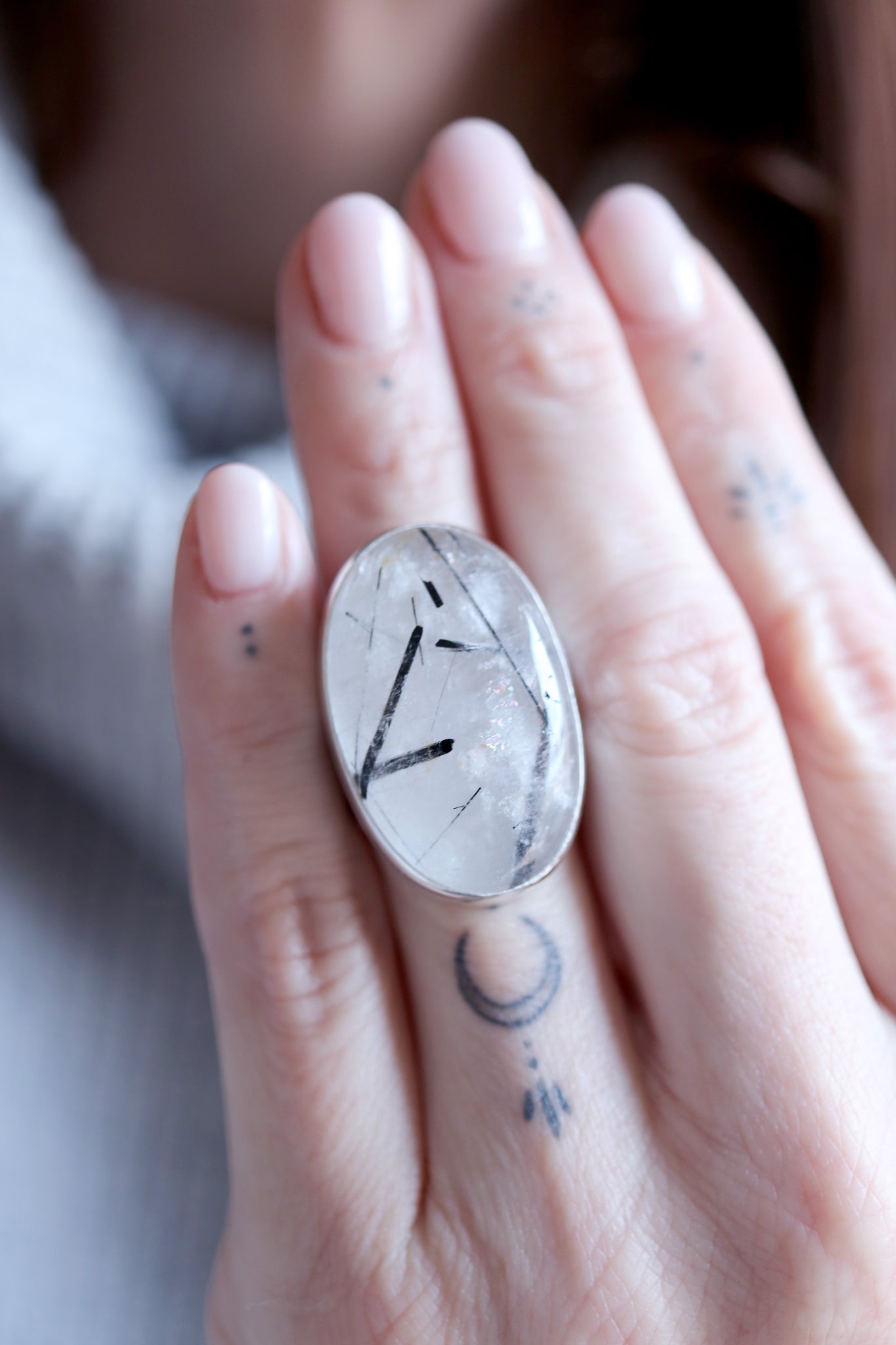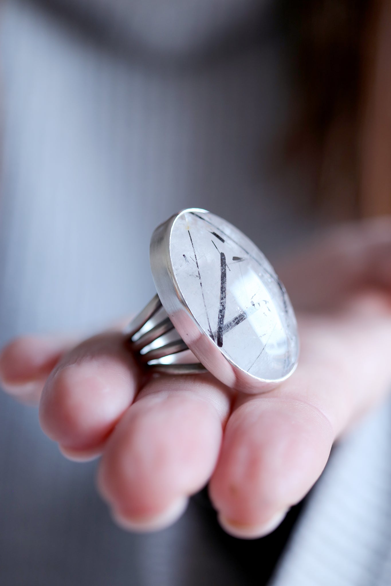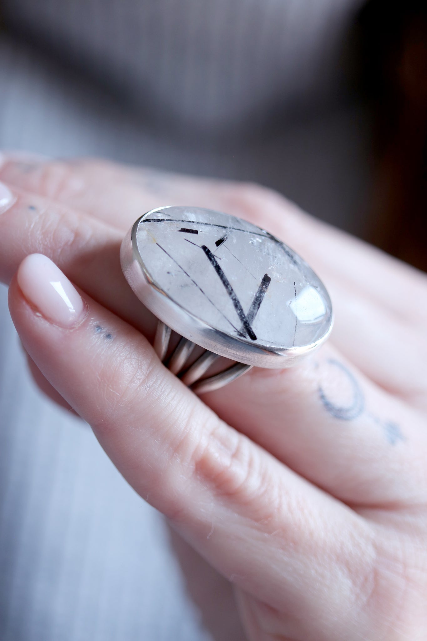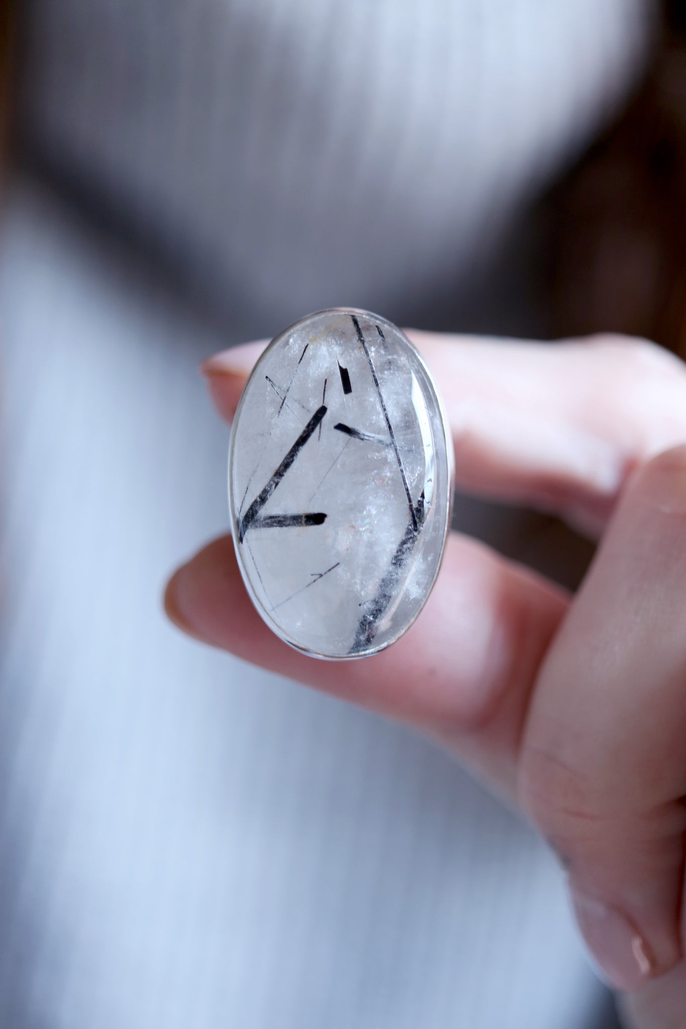 Oval shaped Quartz stone set in a simple sterling silver setting with a wide band.