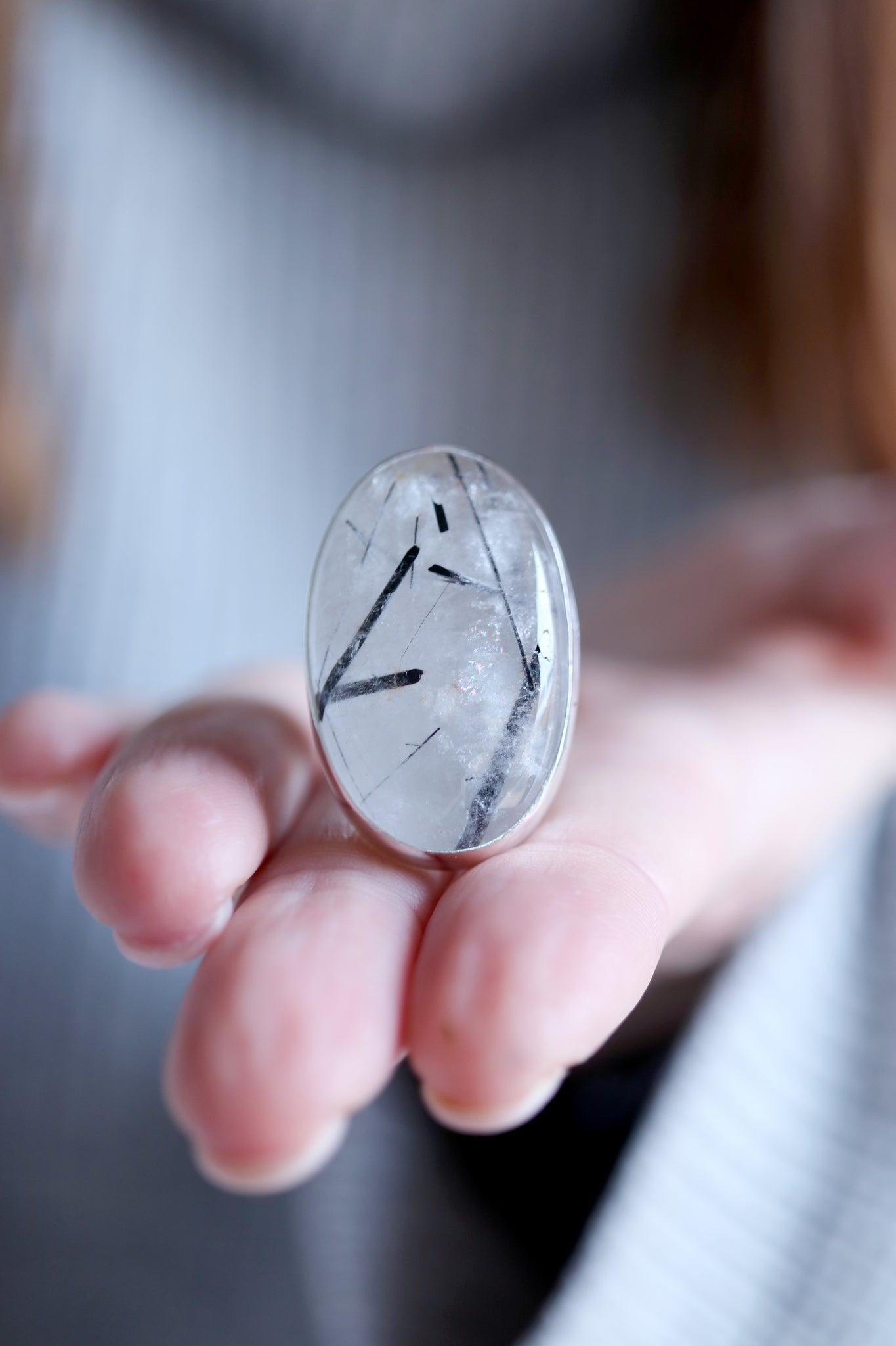 Els cristalls de Quars tenen petits cristalls o agulles de Turmalina negra al seu interior, creant textures i dibuixos. Com més Turmalina tinguin més foscos es veuran. El seu origen és el Brasil.