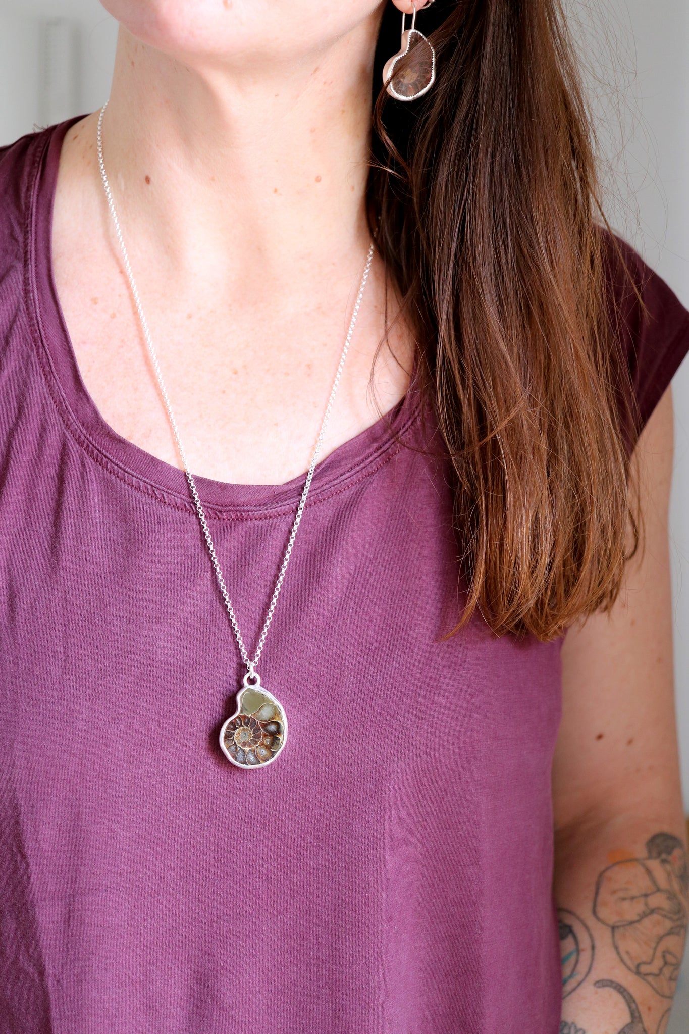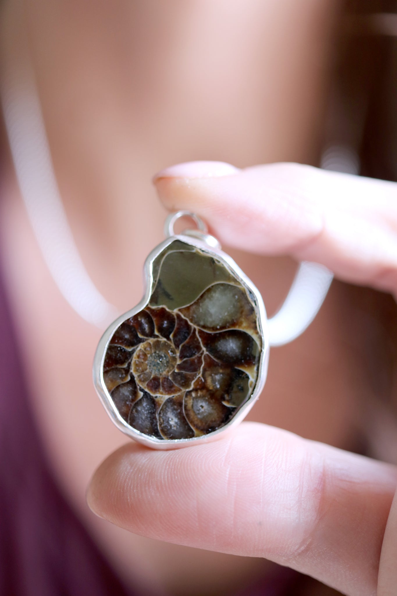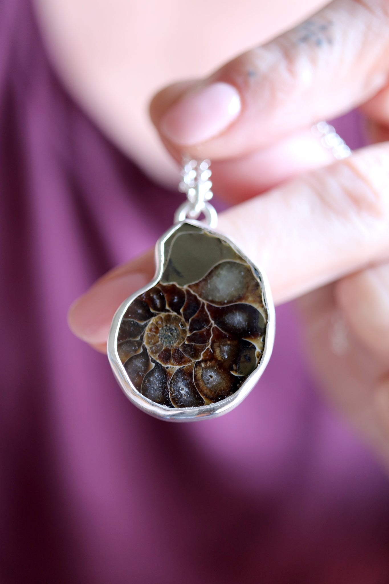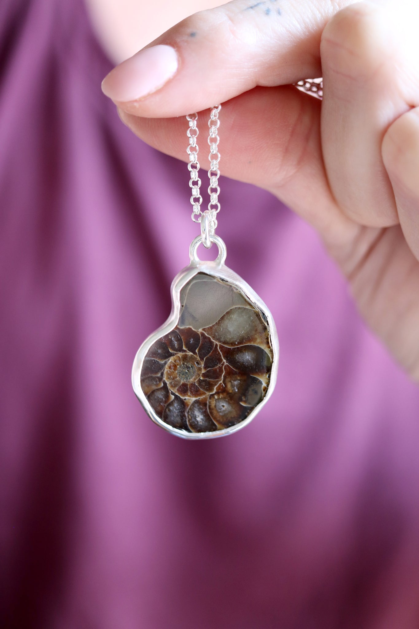 Ammonites are fossils from a kind of mollusk that lived between 400 and 66 million years ago. They are completely natural, undyed, and have brownish tones.