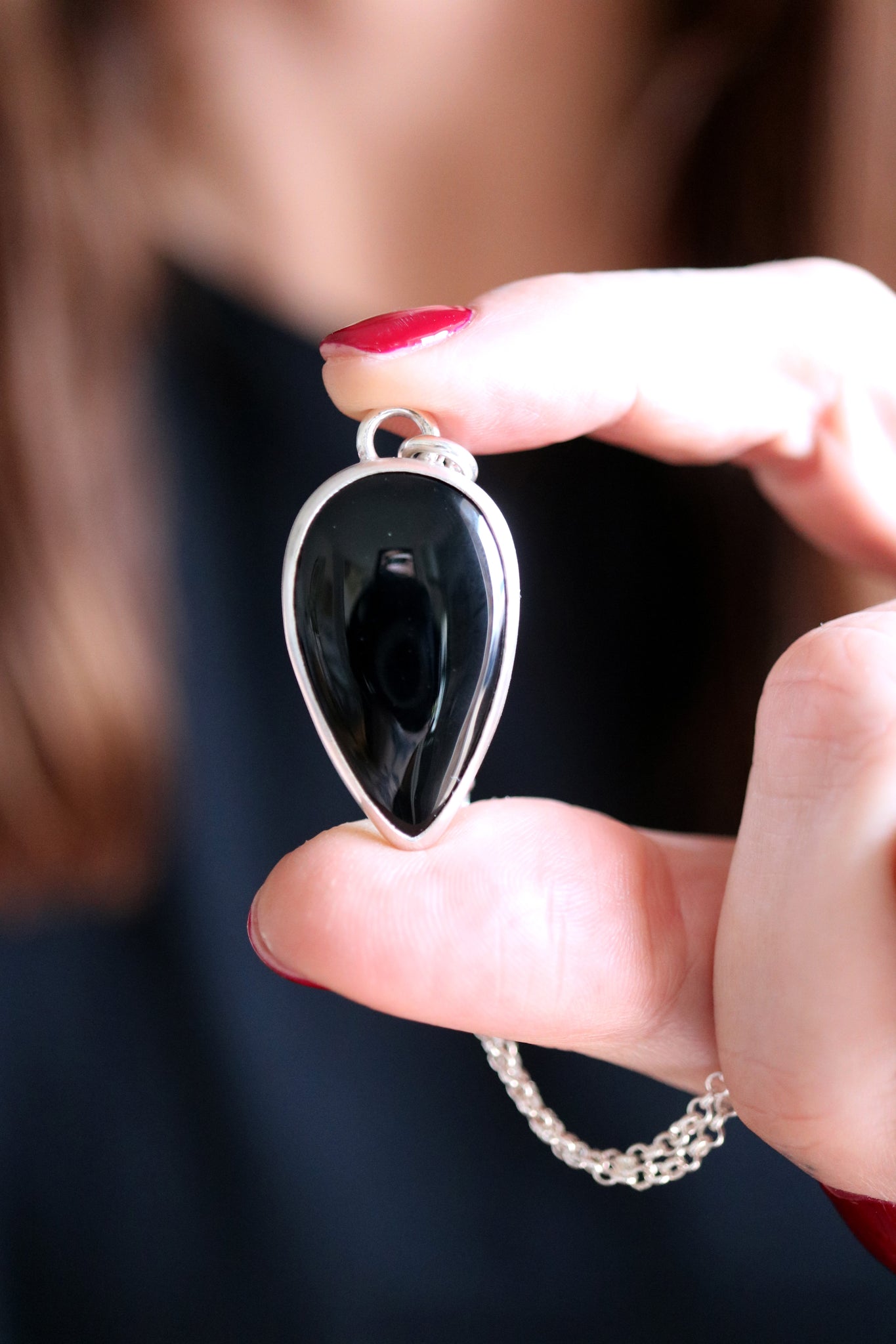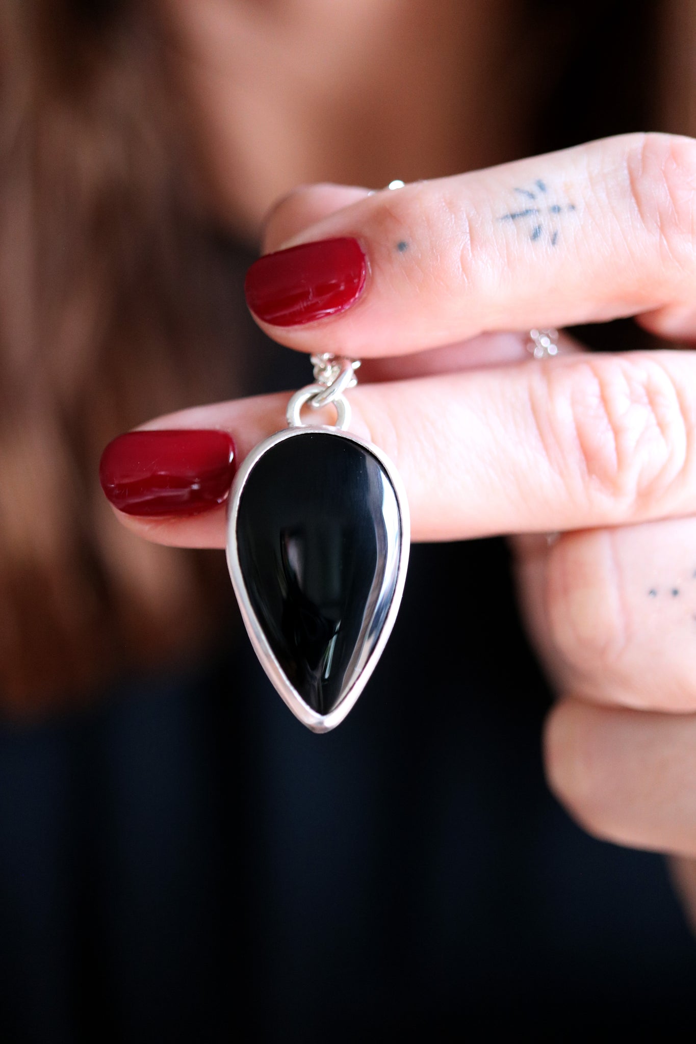Drop shaped Onyx stone set in a simple sterling silver setting with a 45cm long chain. It has some dots sawed at back as decoration.