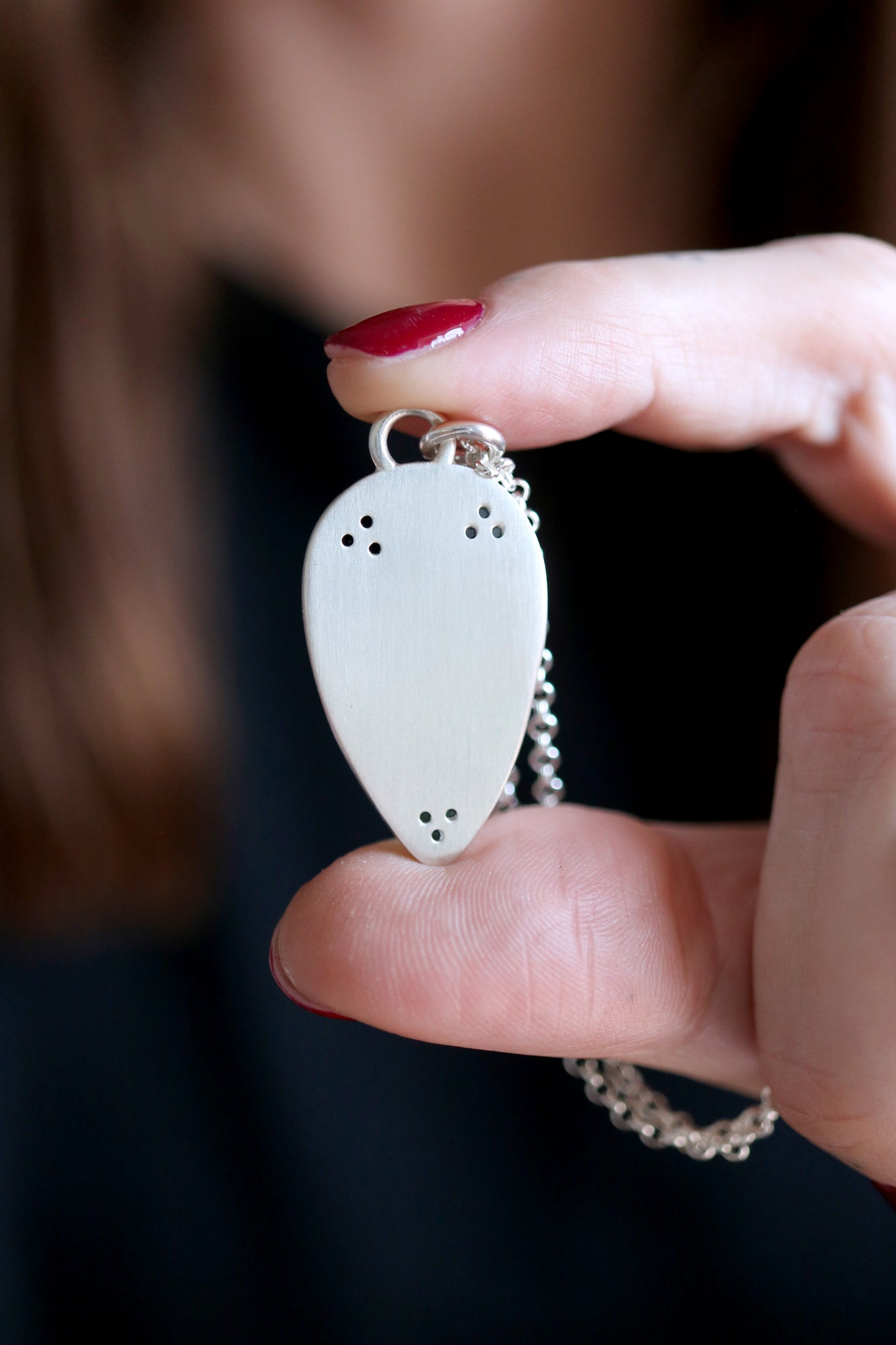 L'Ònix té forma de gota i està muntat amb plata com a penjoll i amb una cadena de 45cm de llarg. Darrere té uns puntets calats com a decoració.