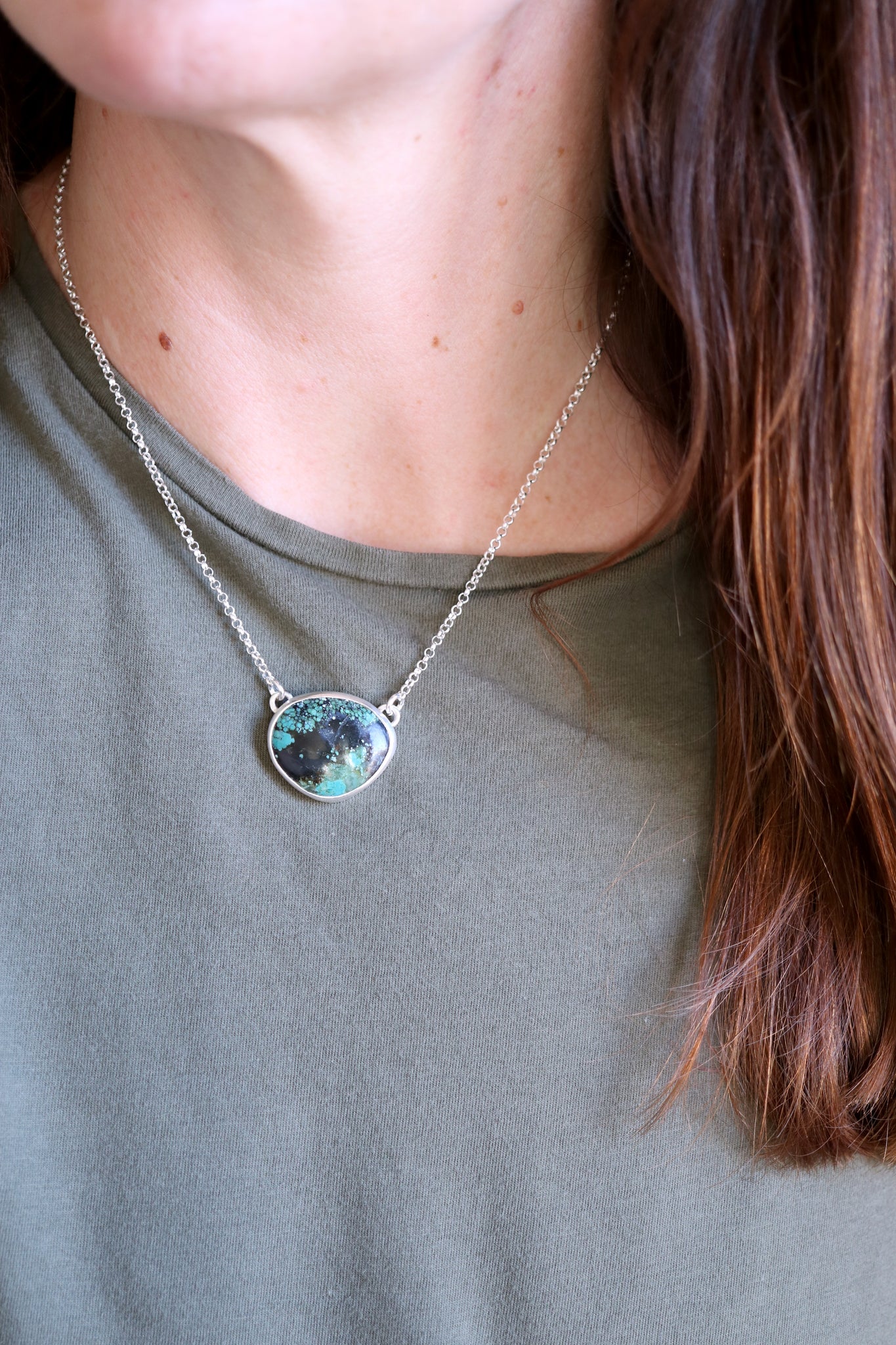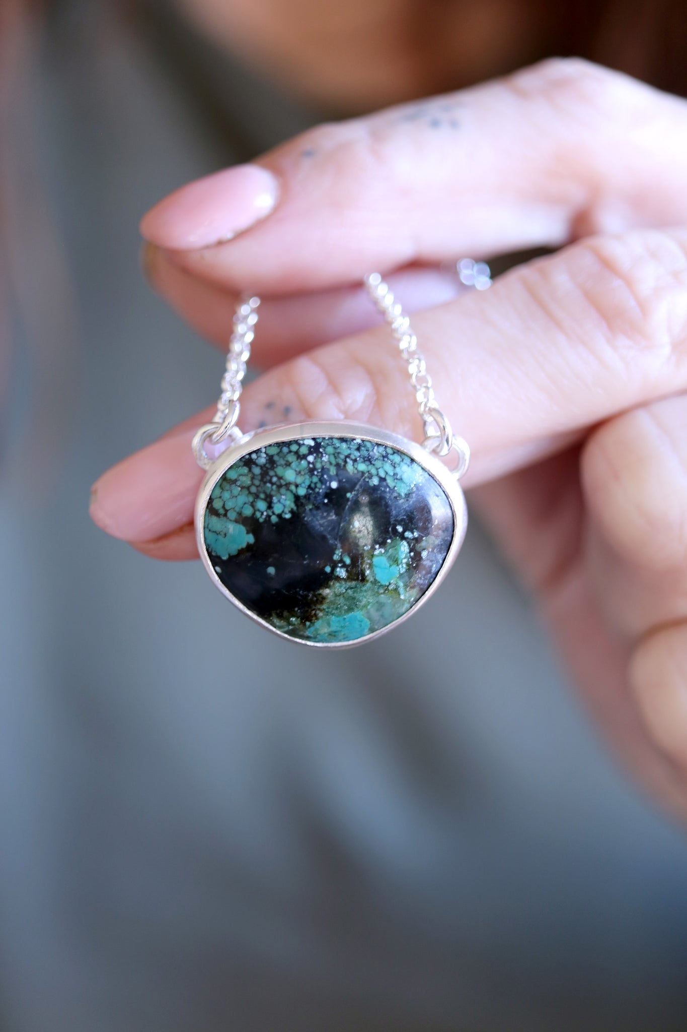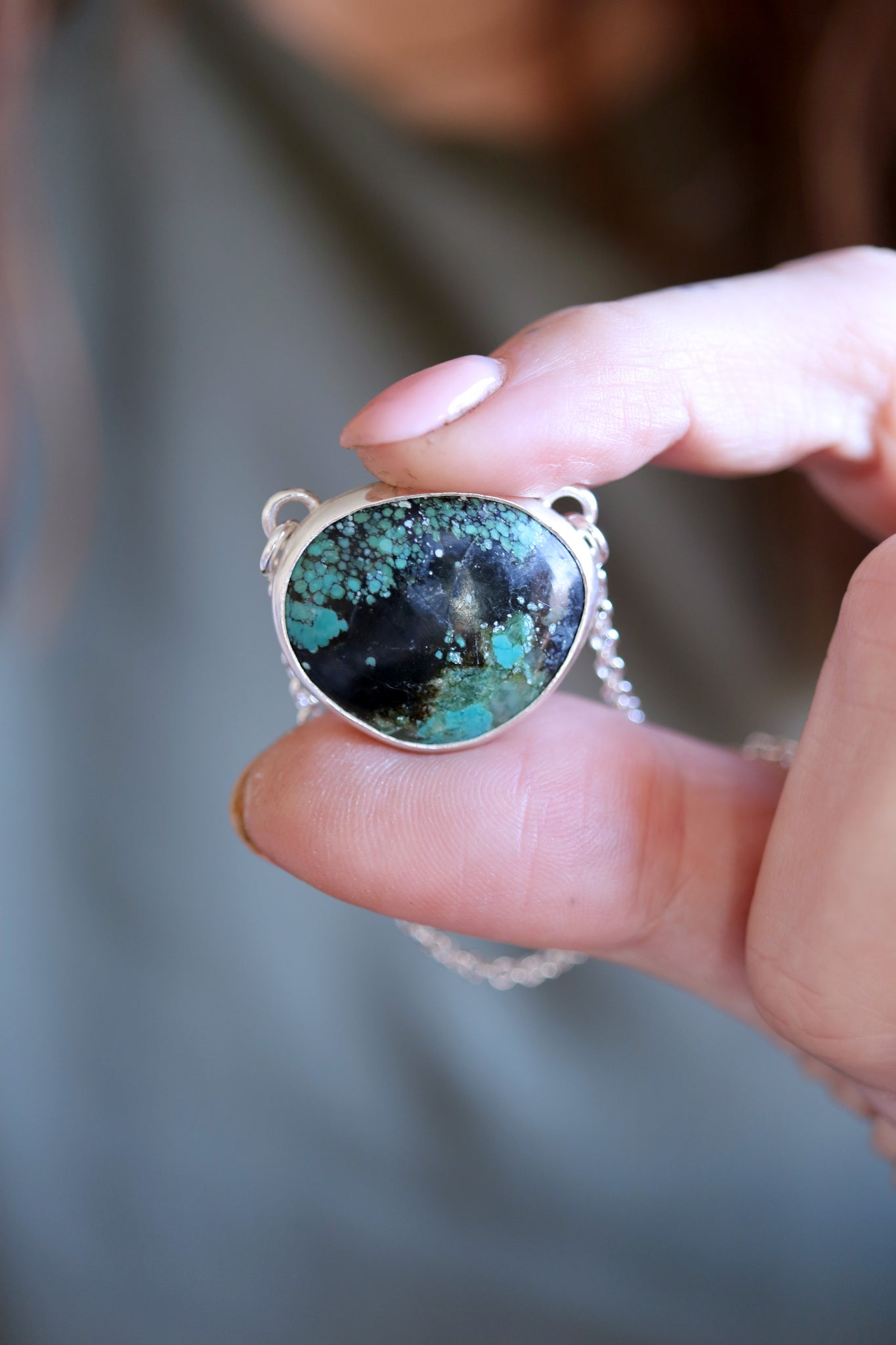 A irregular shaped and handcarved Turquoise stone set in a simple sterling silver setting. It comes from Tibet.