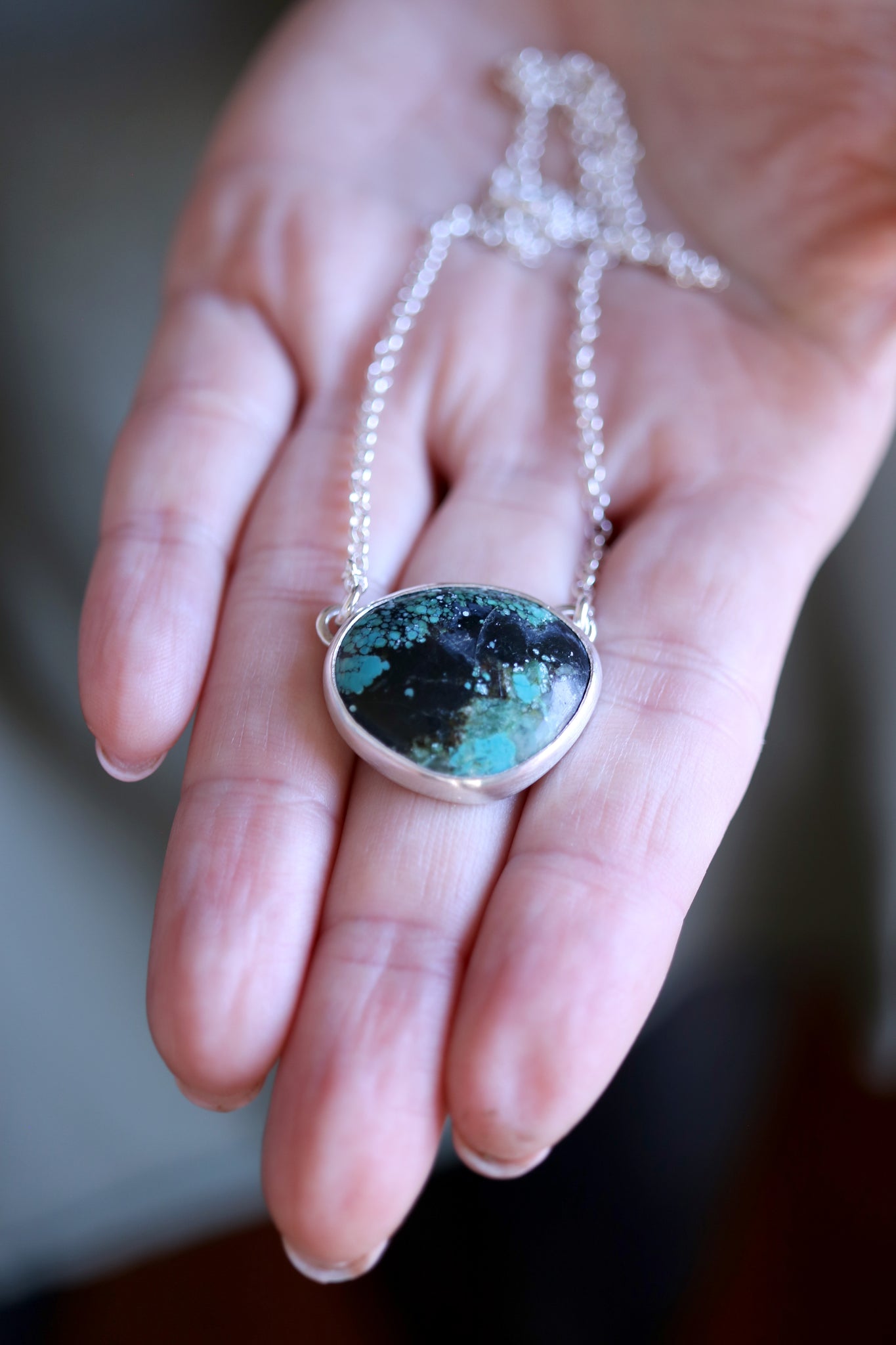 La Turquesa té forma irregular, està muntada amb plata i està tallada a mà. Prové del Tibet.
