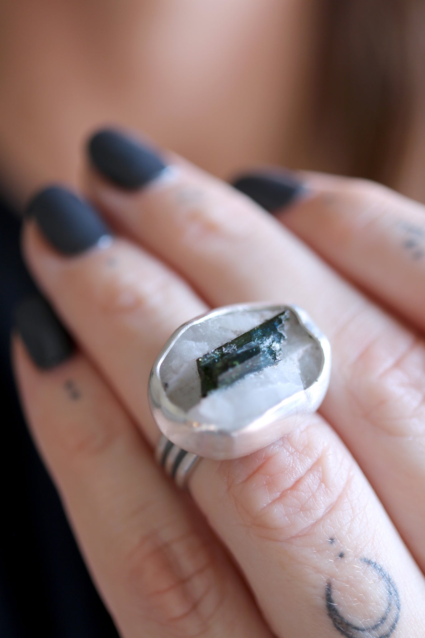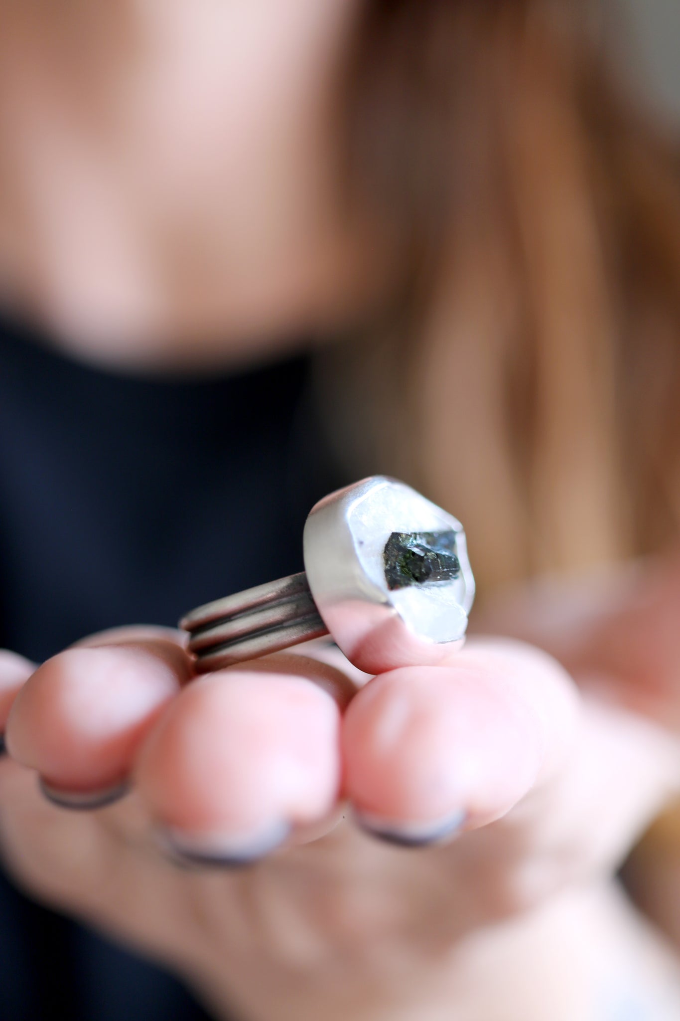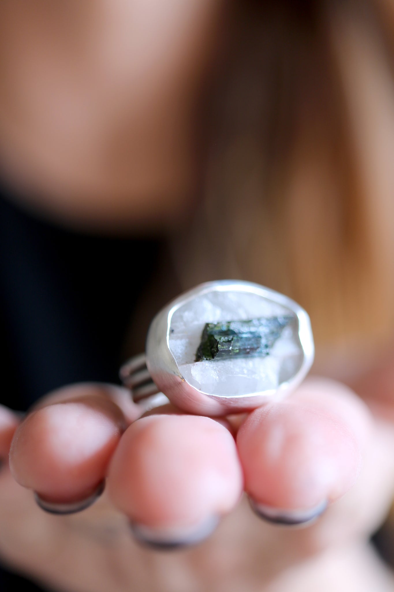 Sterling silver ring with raw Quartz with a green Tourmaline crystal.