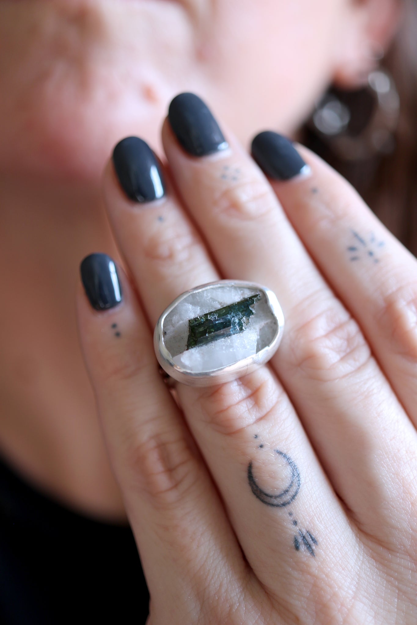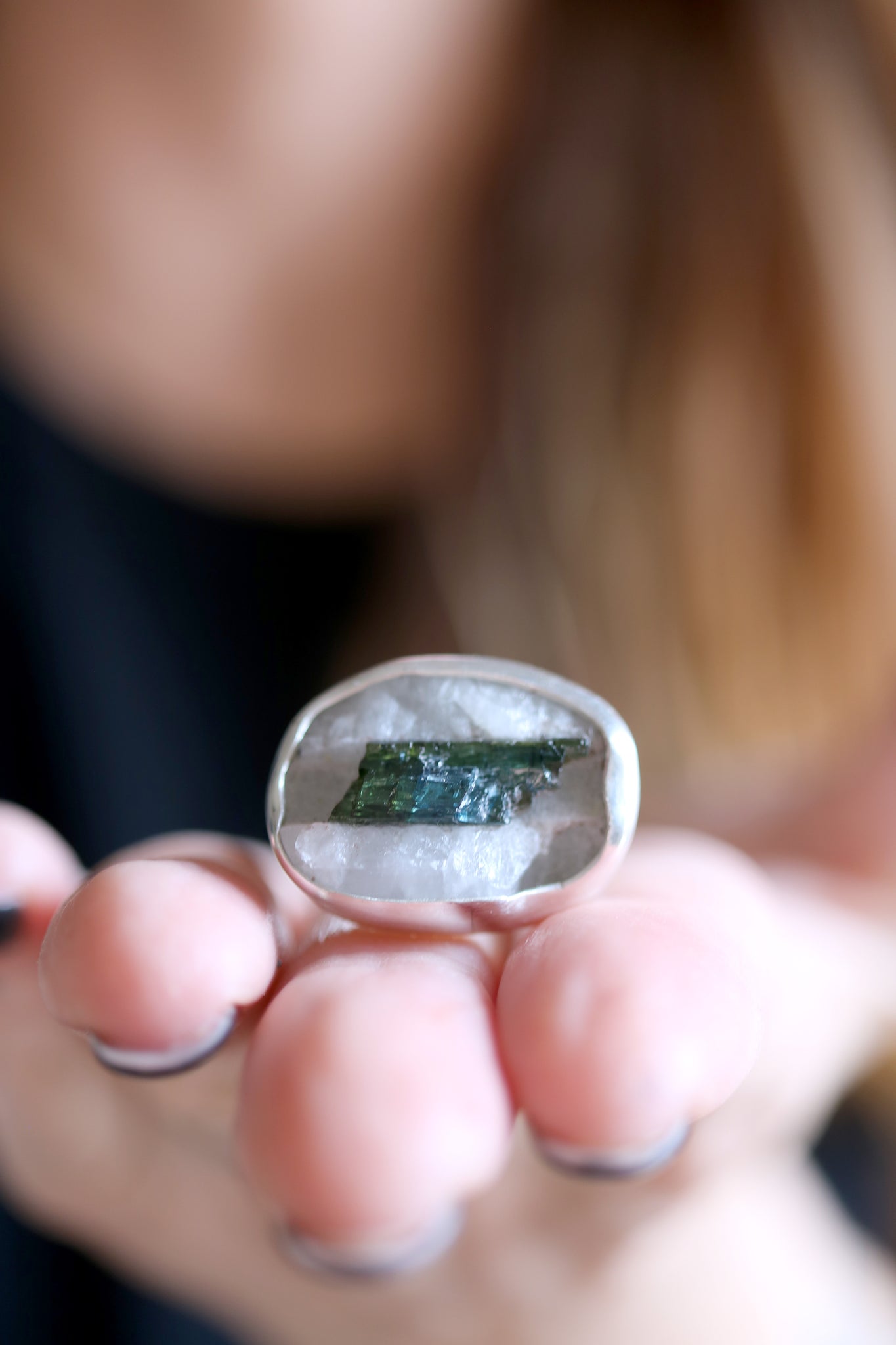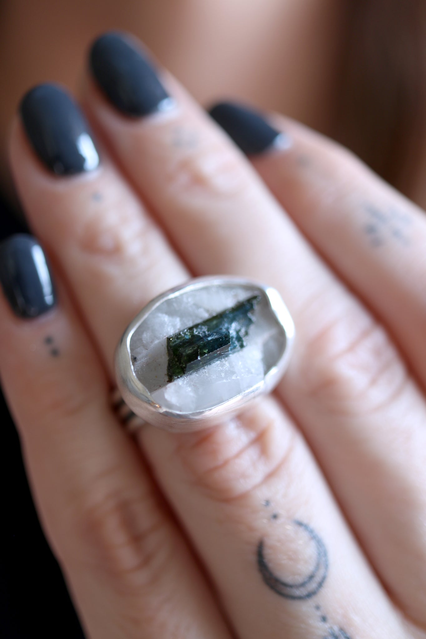 Sterling silver ring with raw Quartz with a green Tourmaline crystal.
