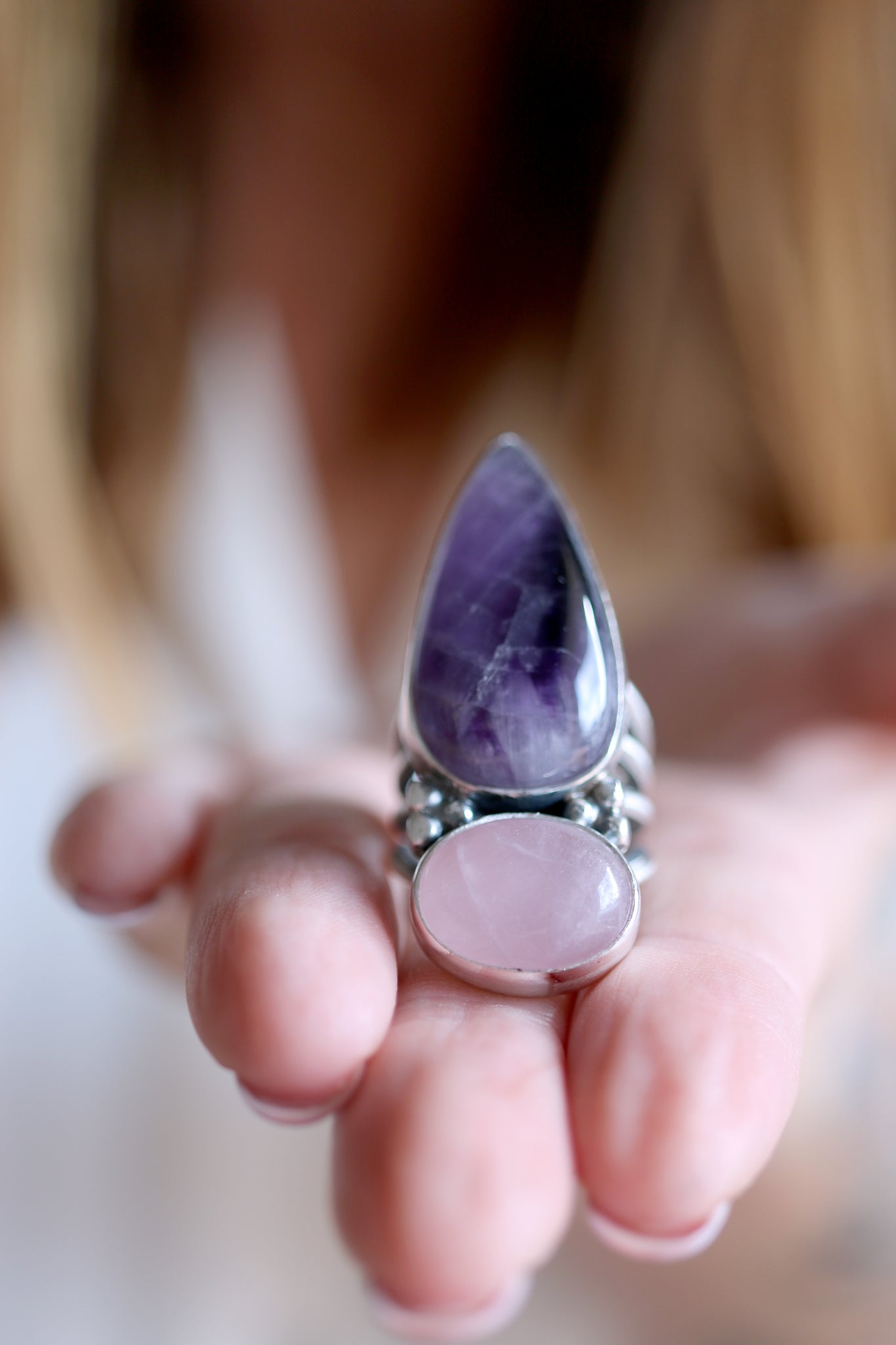 Stone sizes: Pink Quartz 16 x 13mm / Amethyst 30 x 17mm.