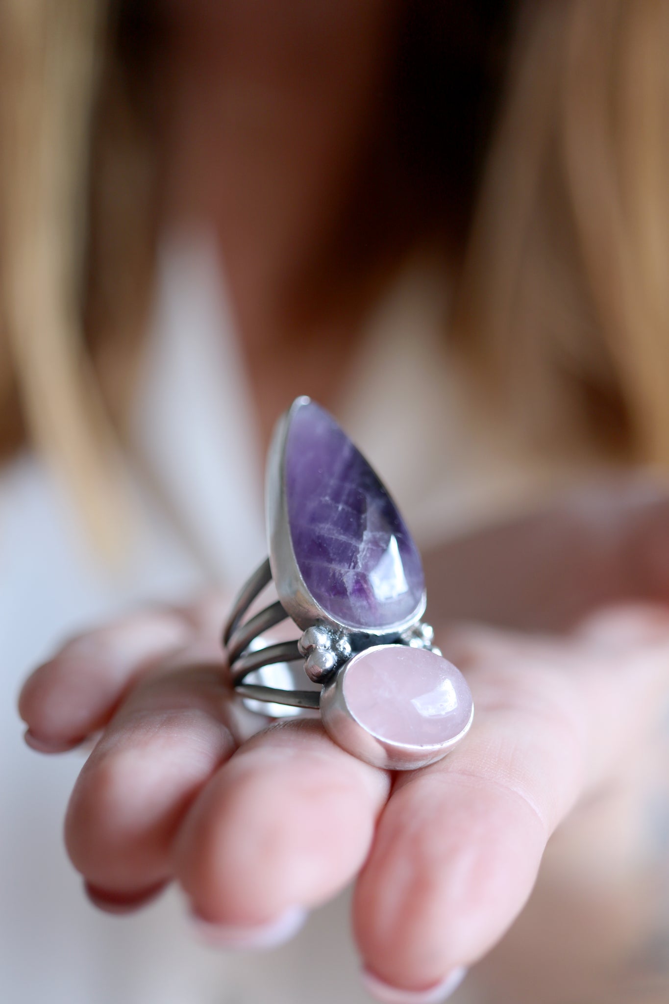 Sterling silver ring with natural Pink Quartz and Amethyst.