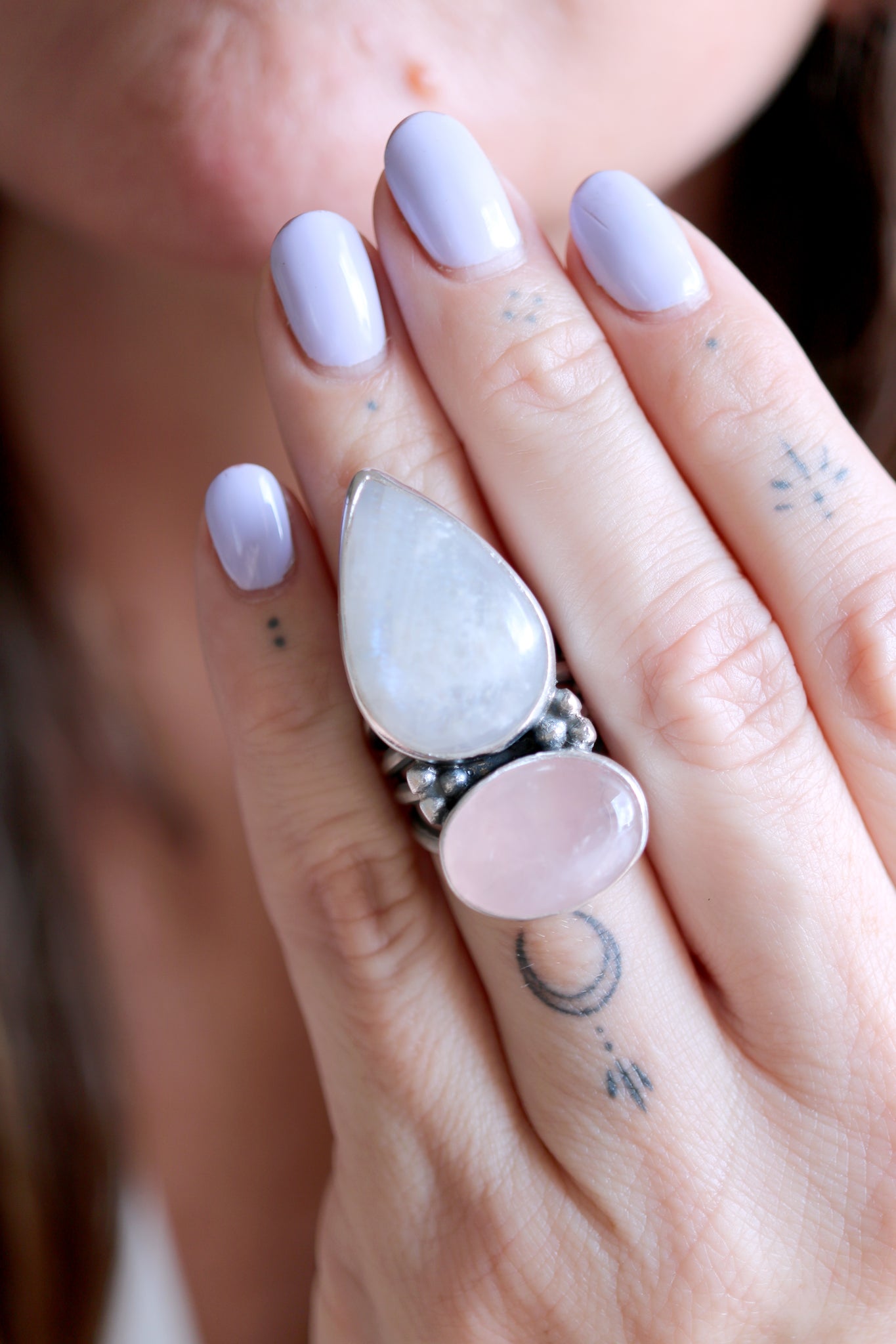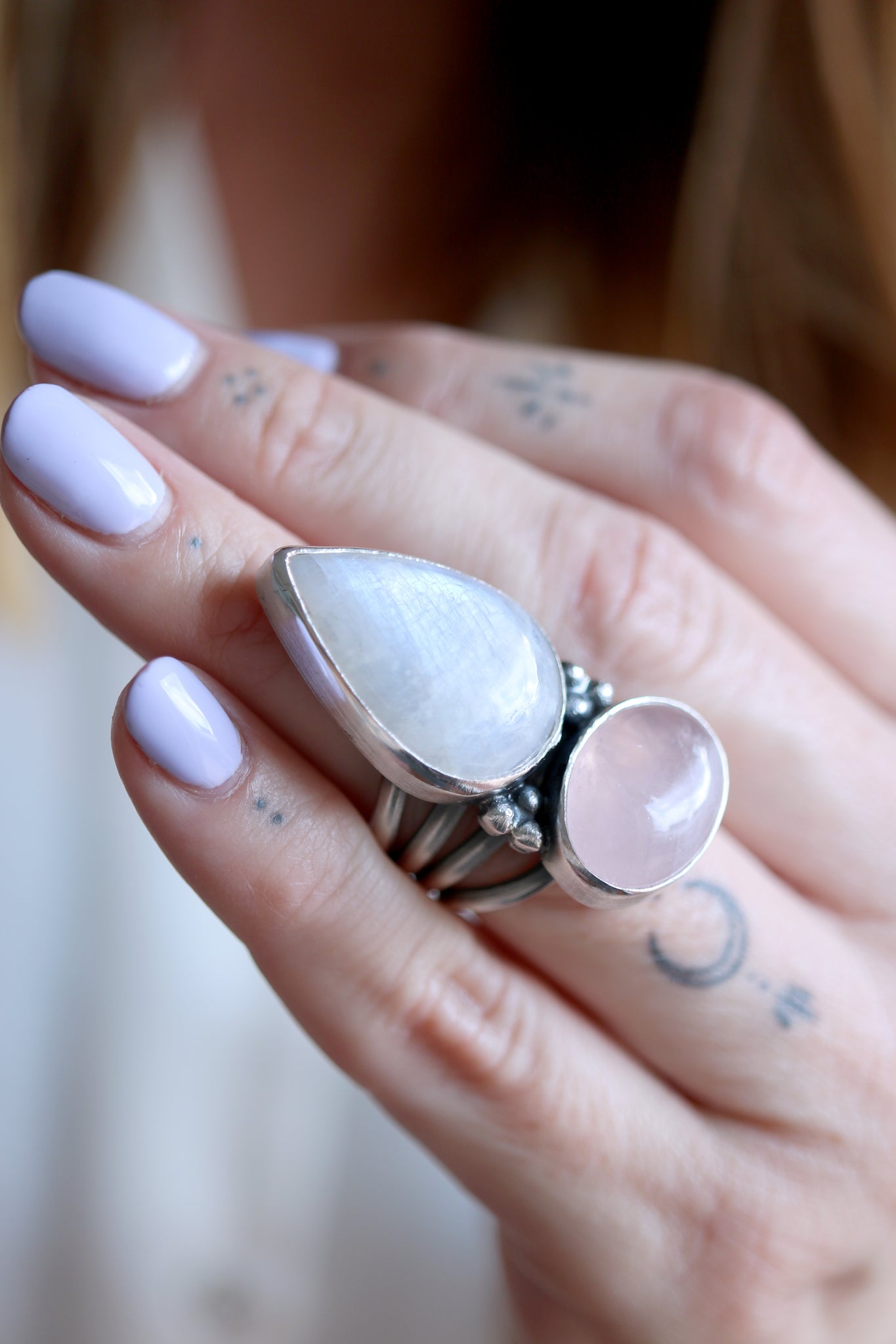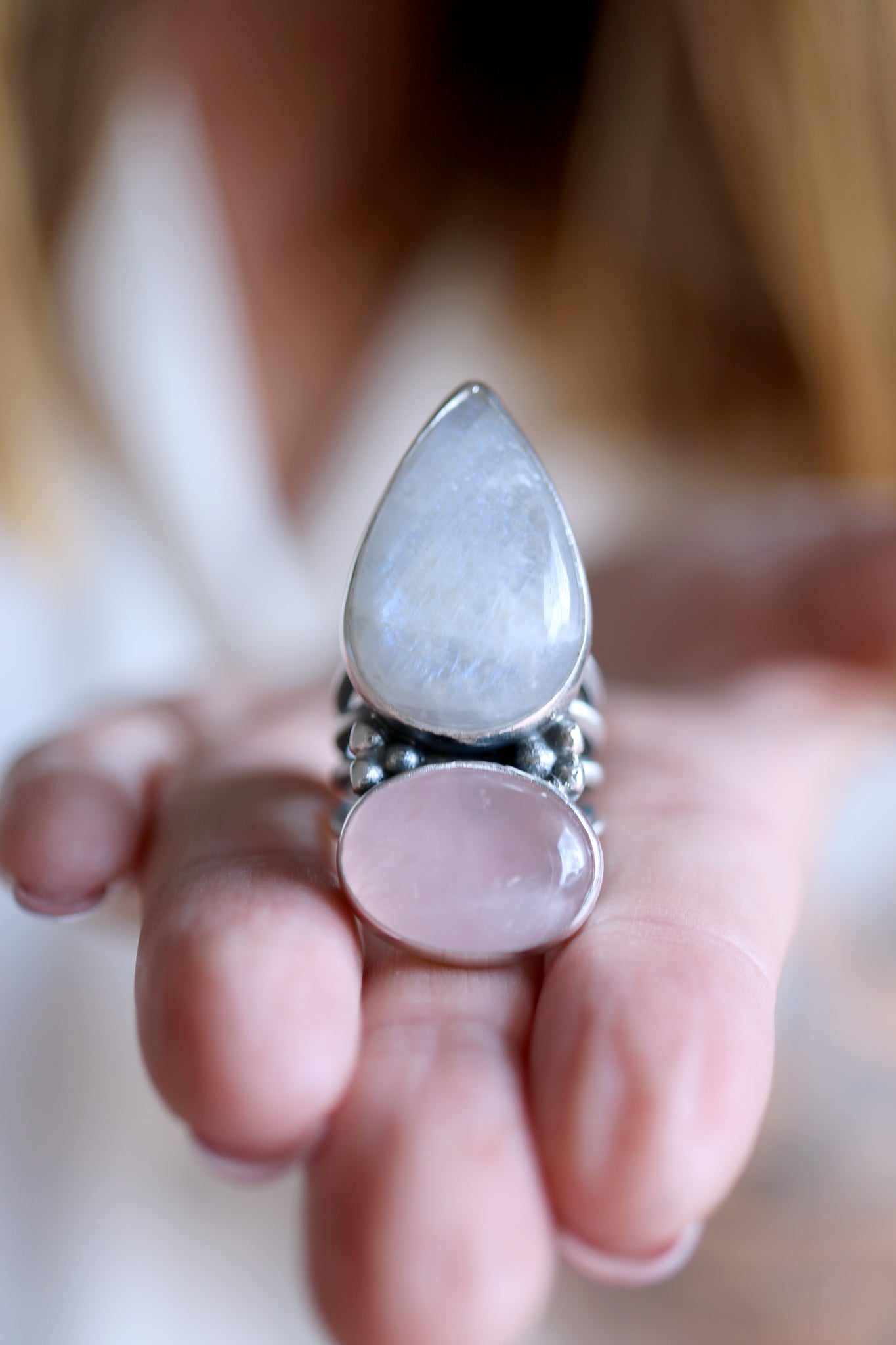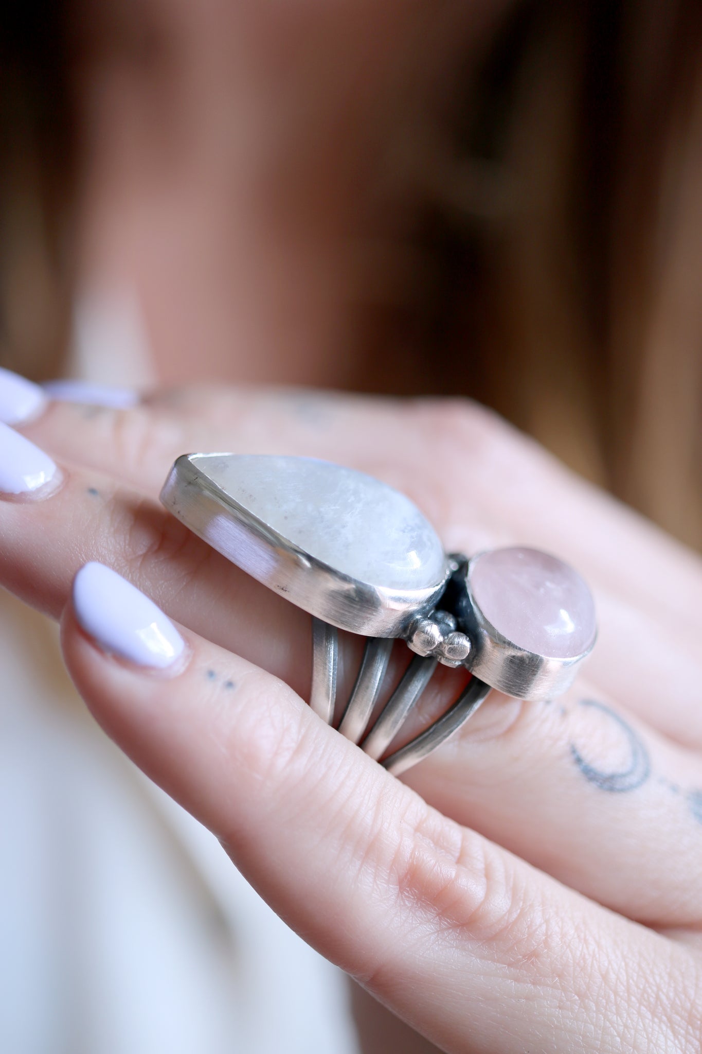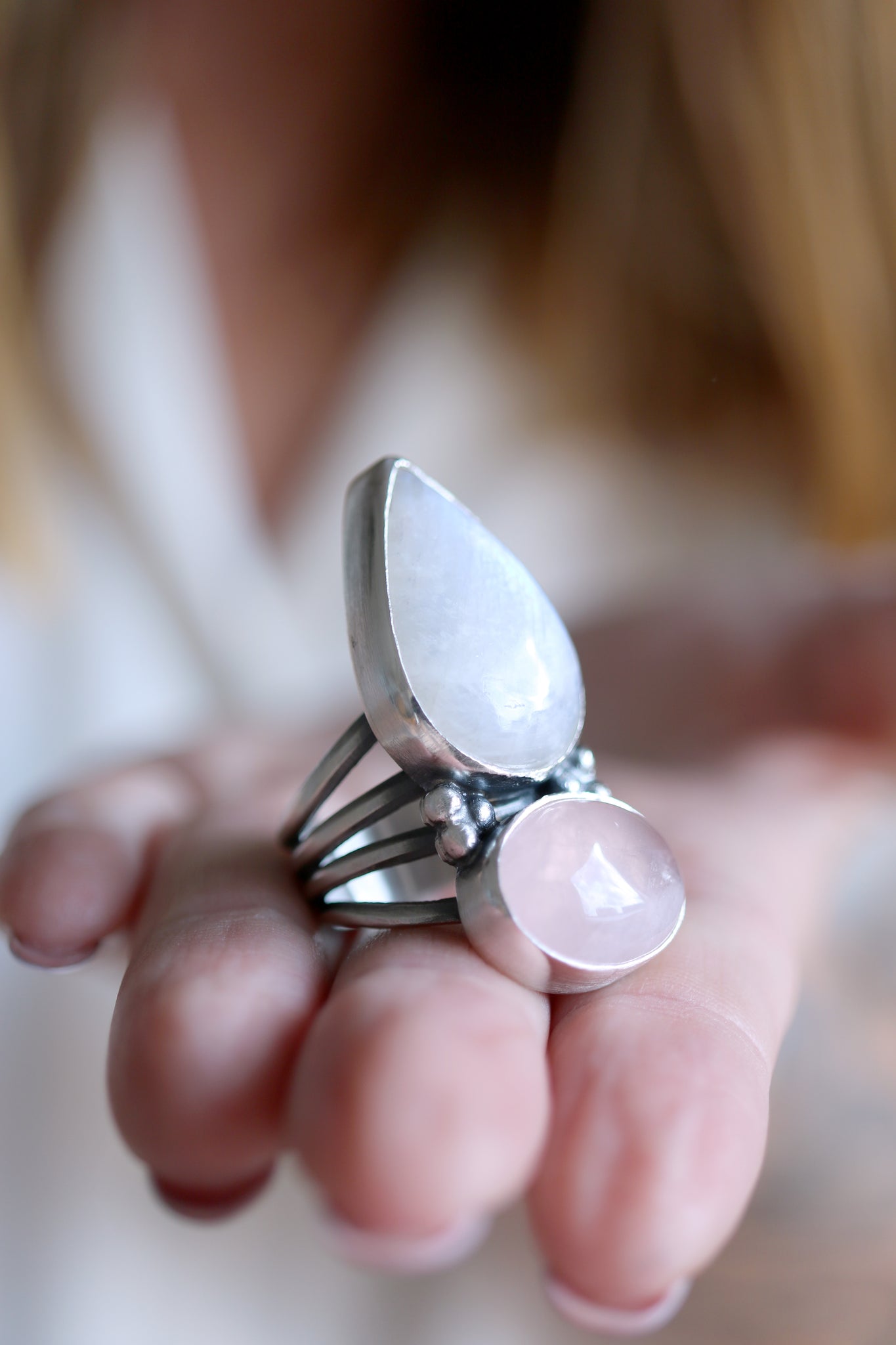 Sterling silver ring with natural Pink Quartz and Moonstone.