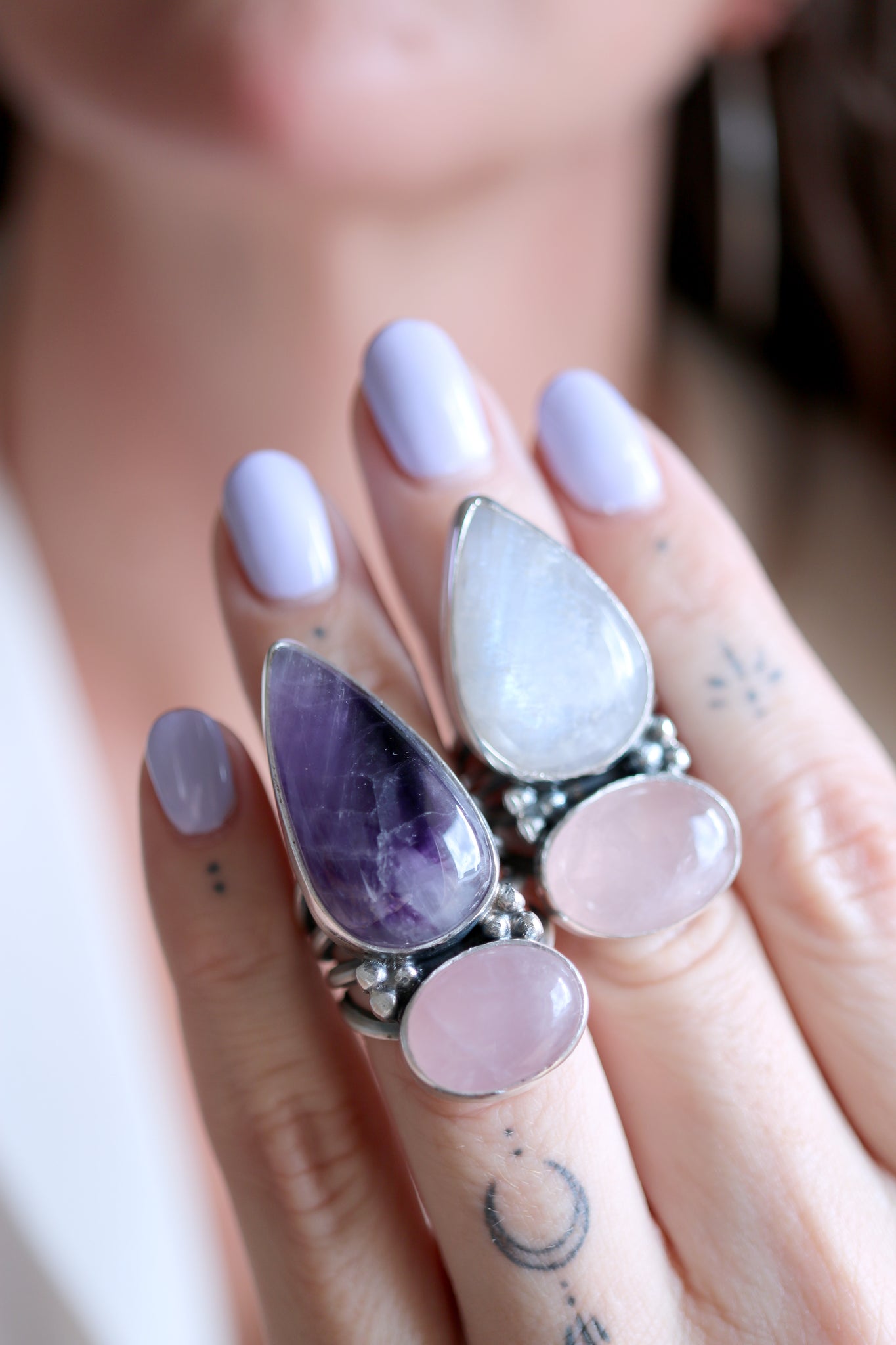 Stone sizes: Pink Quartz 19 x 14mm / Moonstone 27 x 18mm.