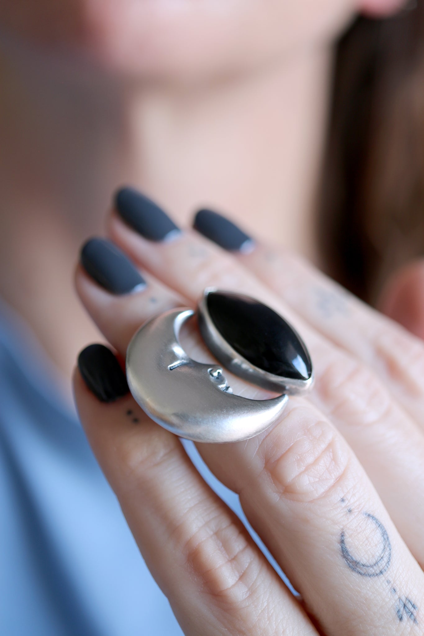 Anell de mitja Lluna de plata amb Obsidiana natural.