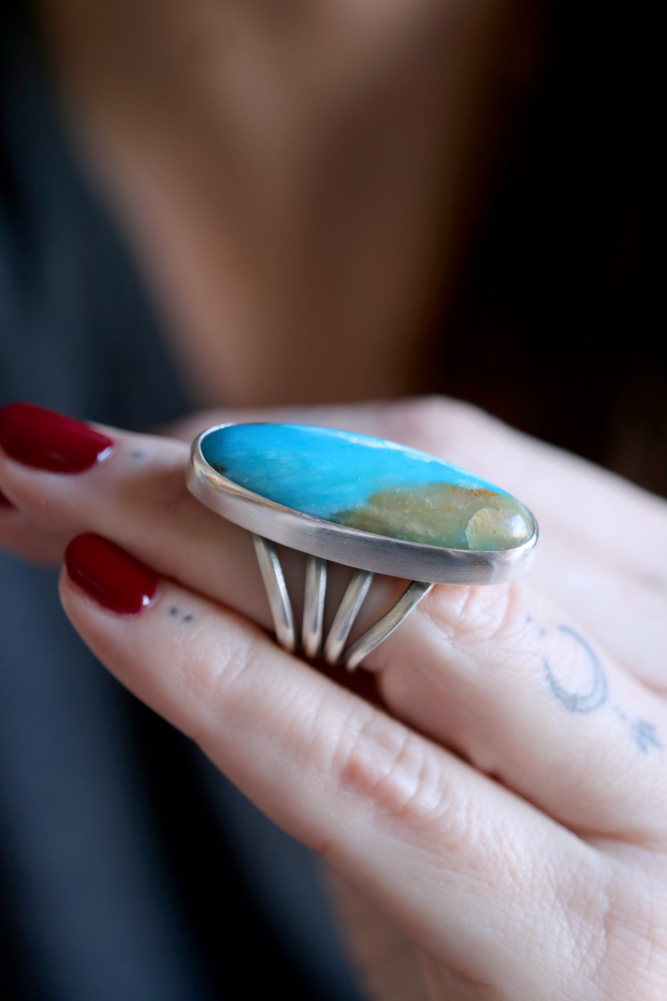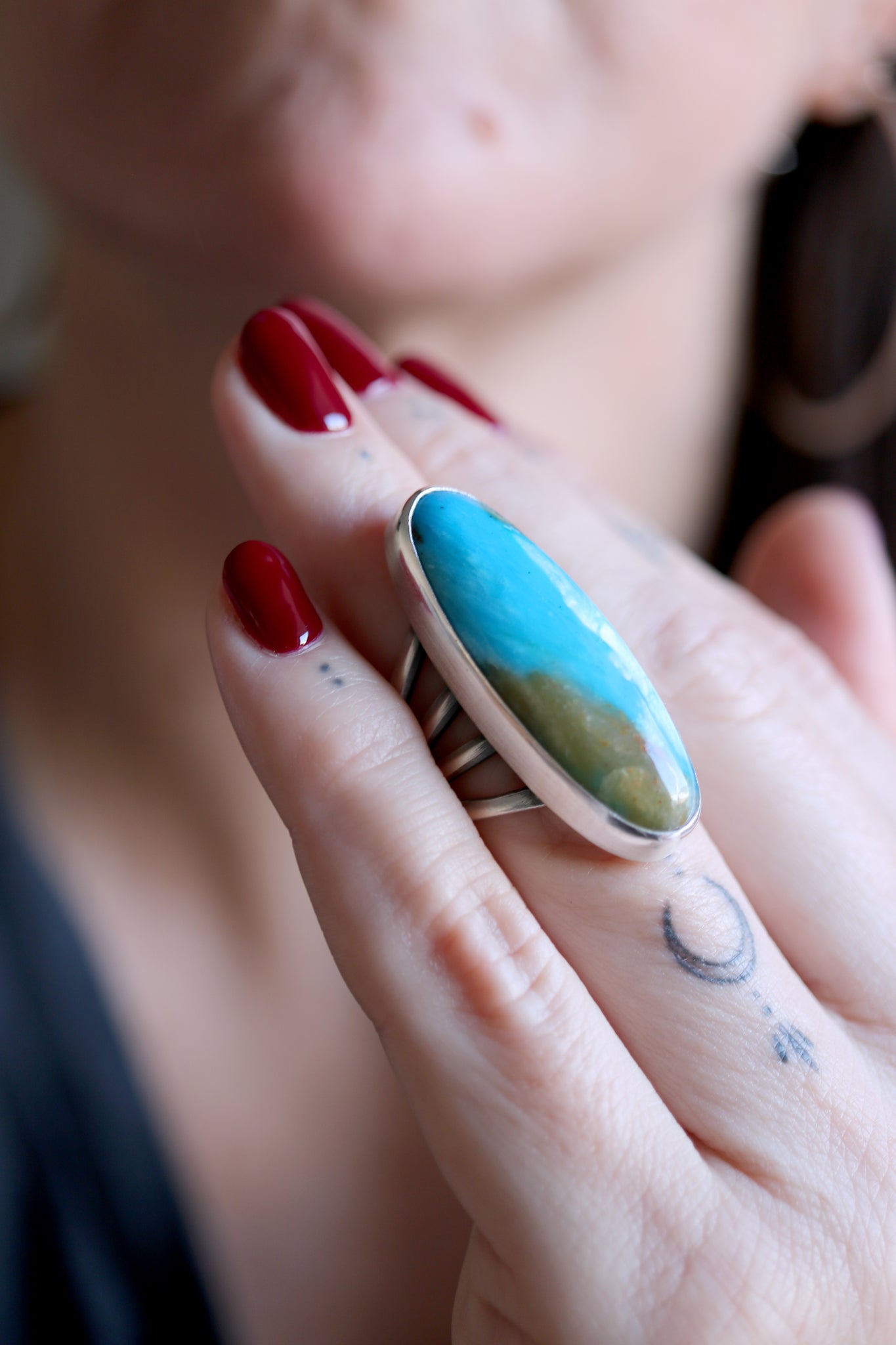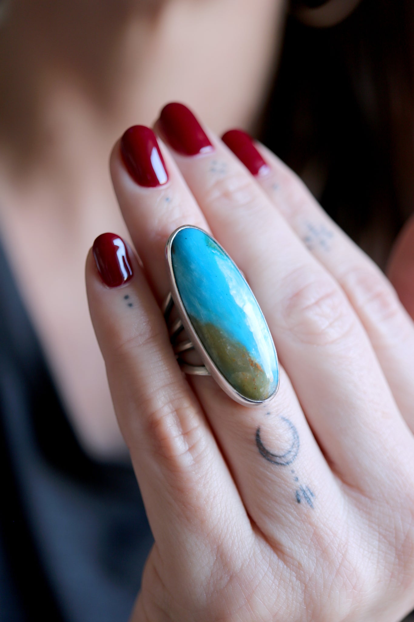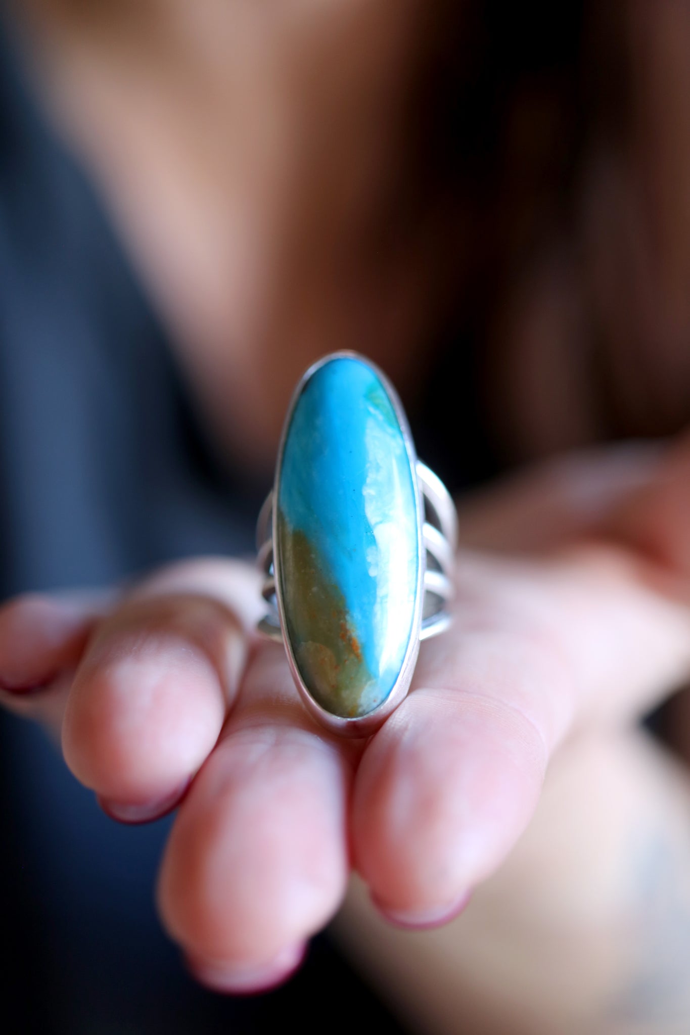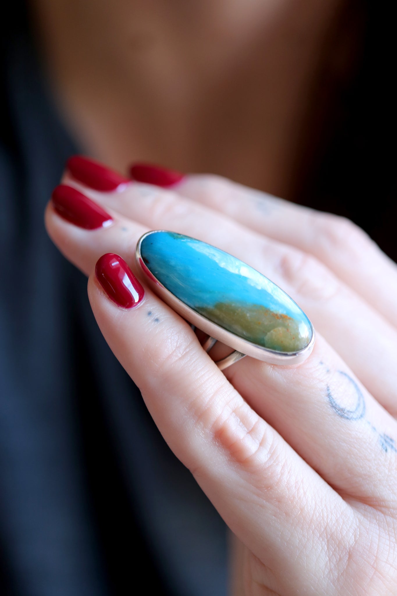 An oval shaped Opal stone set in a simple sterling silver setting with a wide band.