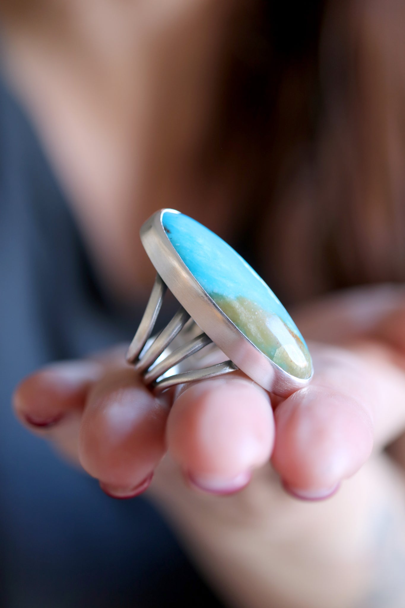 L'Òpal té forma ovalada i està muntat amb plata i amb un braç ample.