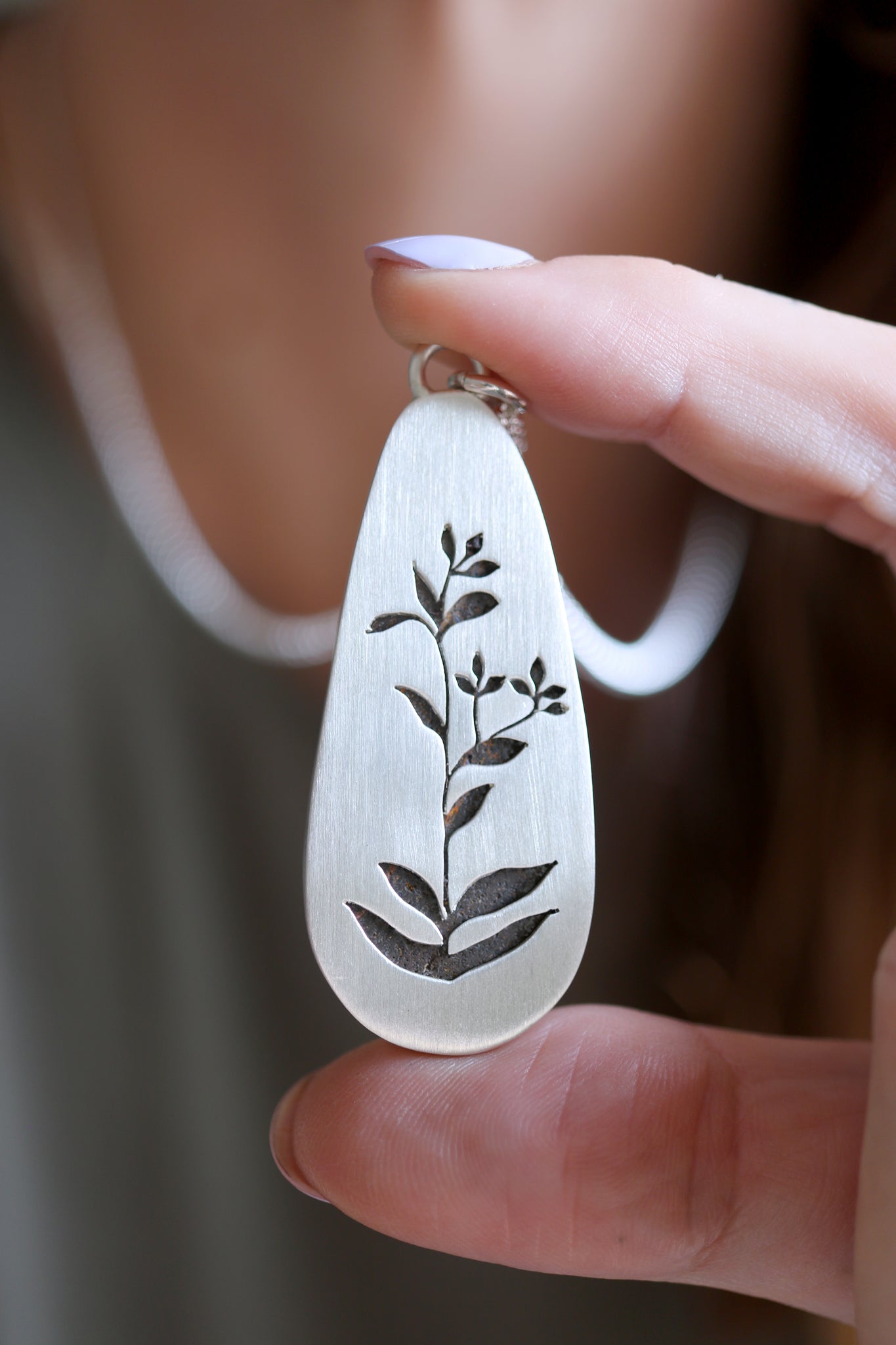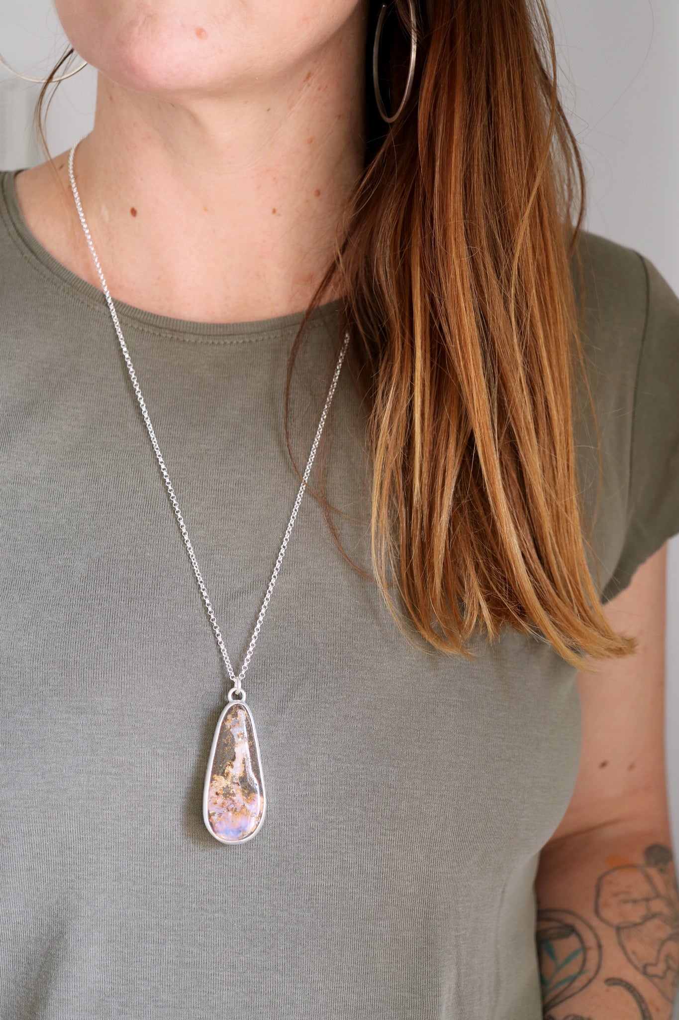 An irregular shaped Opal stone set in a simple sterling silver setting with a sterling silver 70cm chain. It has a plant picture sawed at back.
