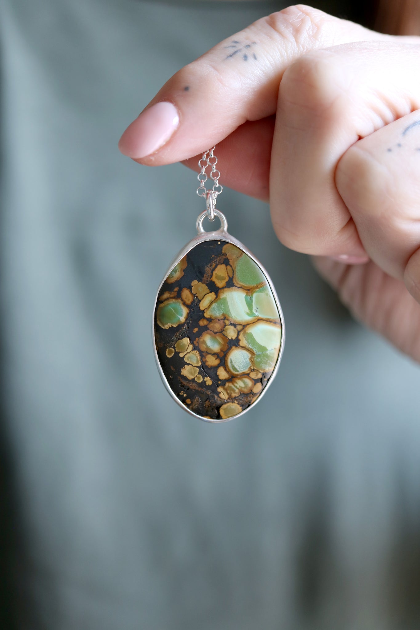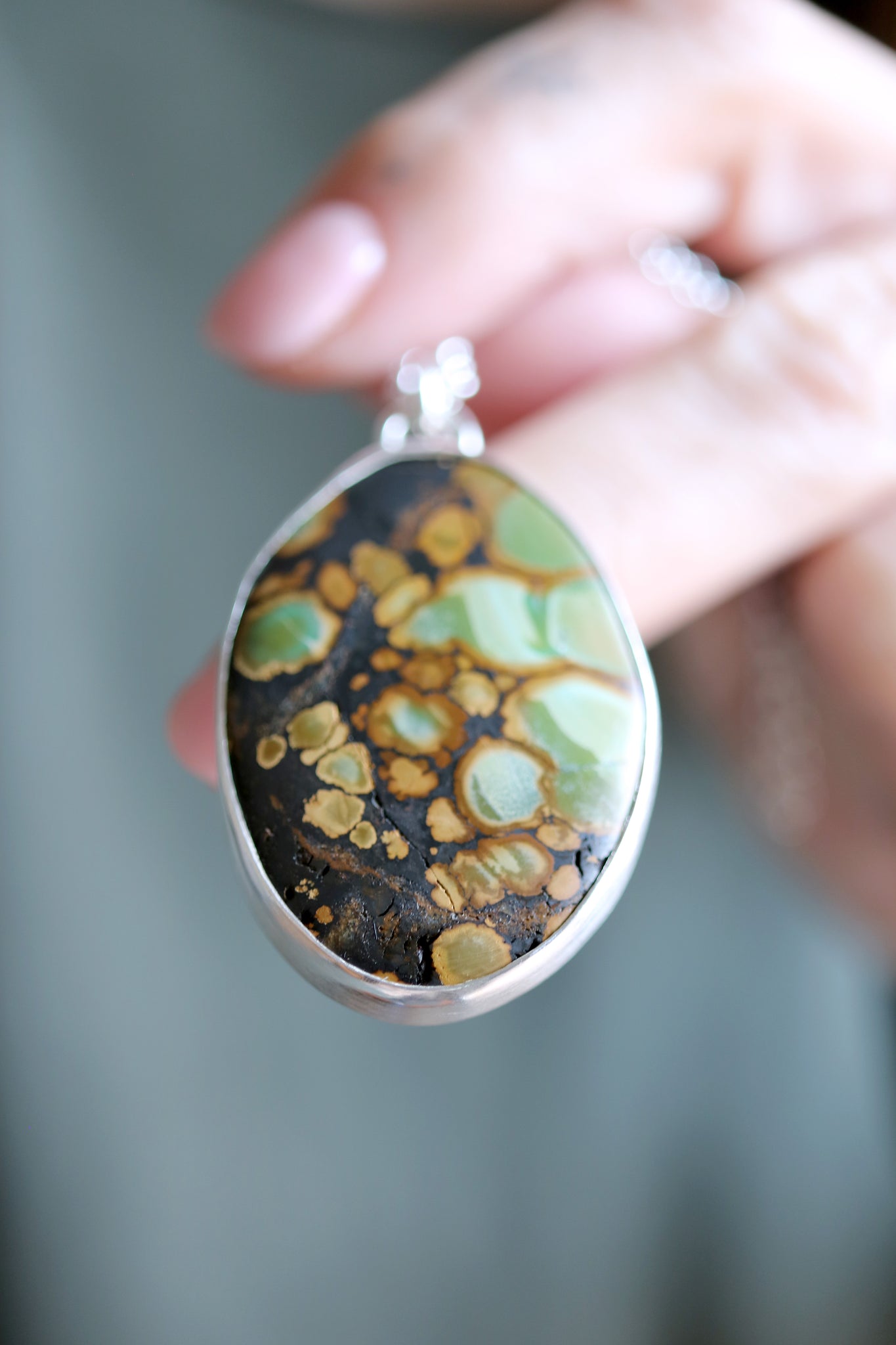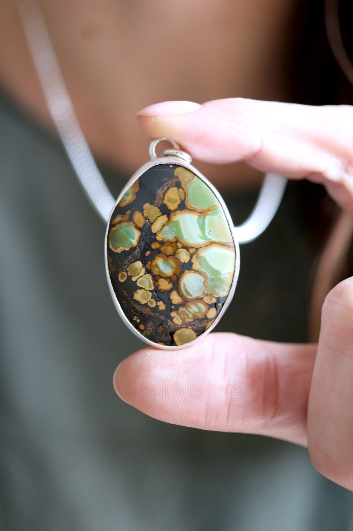 A irregular shaped and handcarved Turquoise stone set in a simple sterling silver setting. It comes from Tibet.