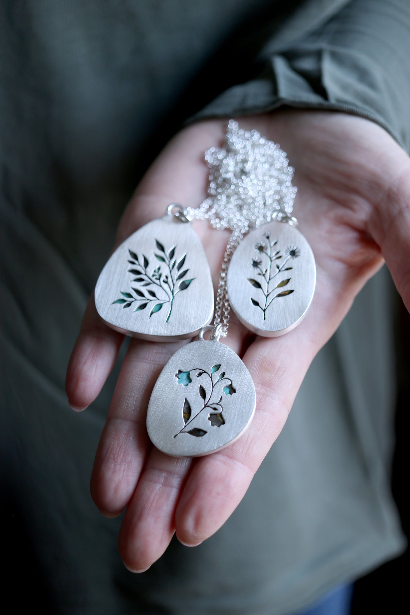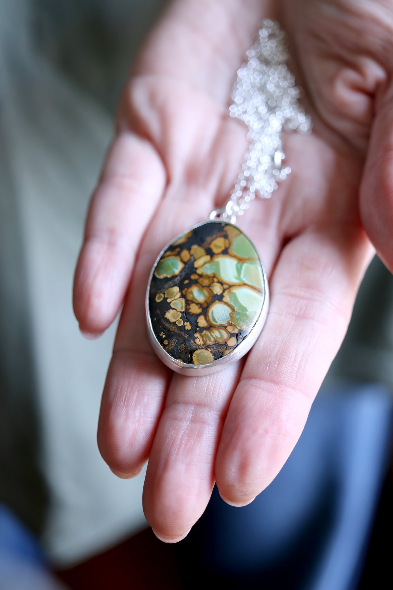 La Turquesa té forma irregular, està muntada amb plata i està tallada a mà. Prové del Tibet.