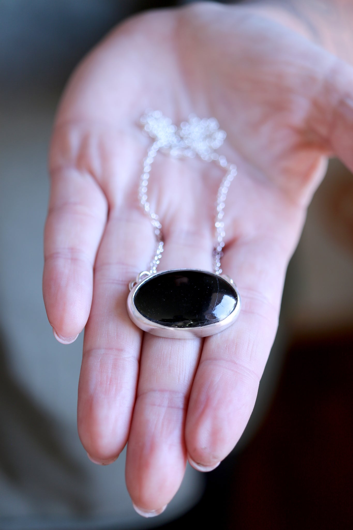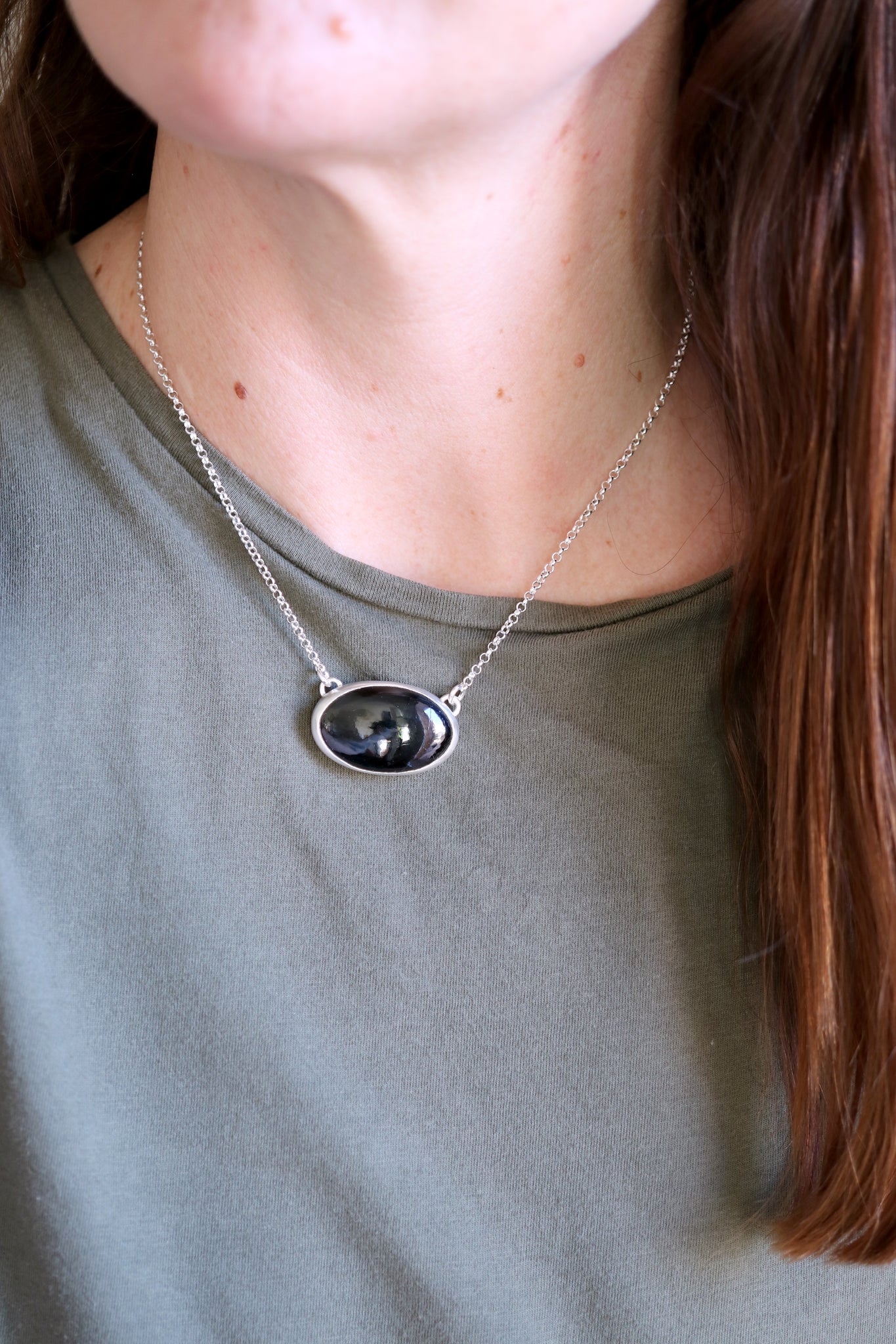 Oval shaped Black Tourmaline stone set in a simple sterling silver setting with a 45cm long chain.