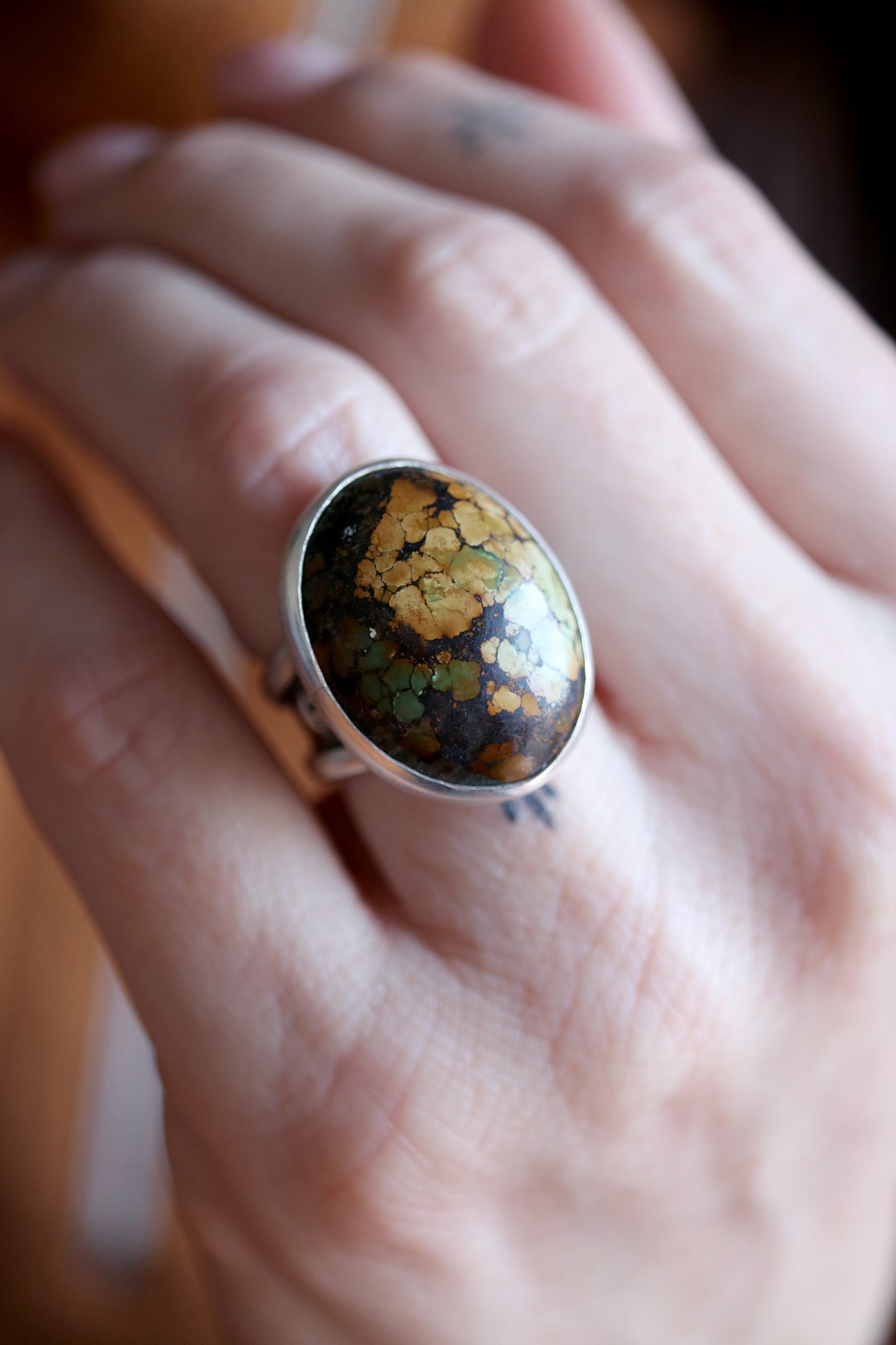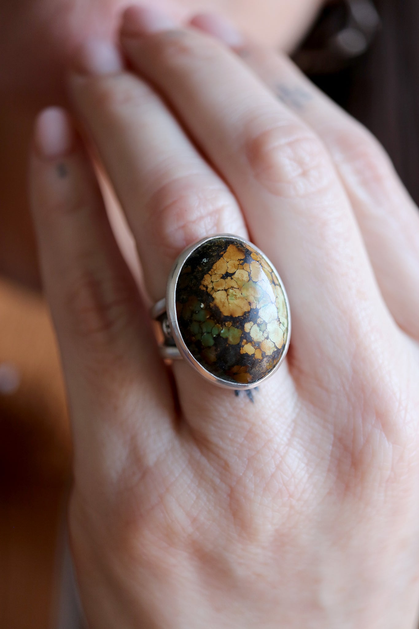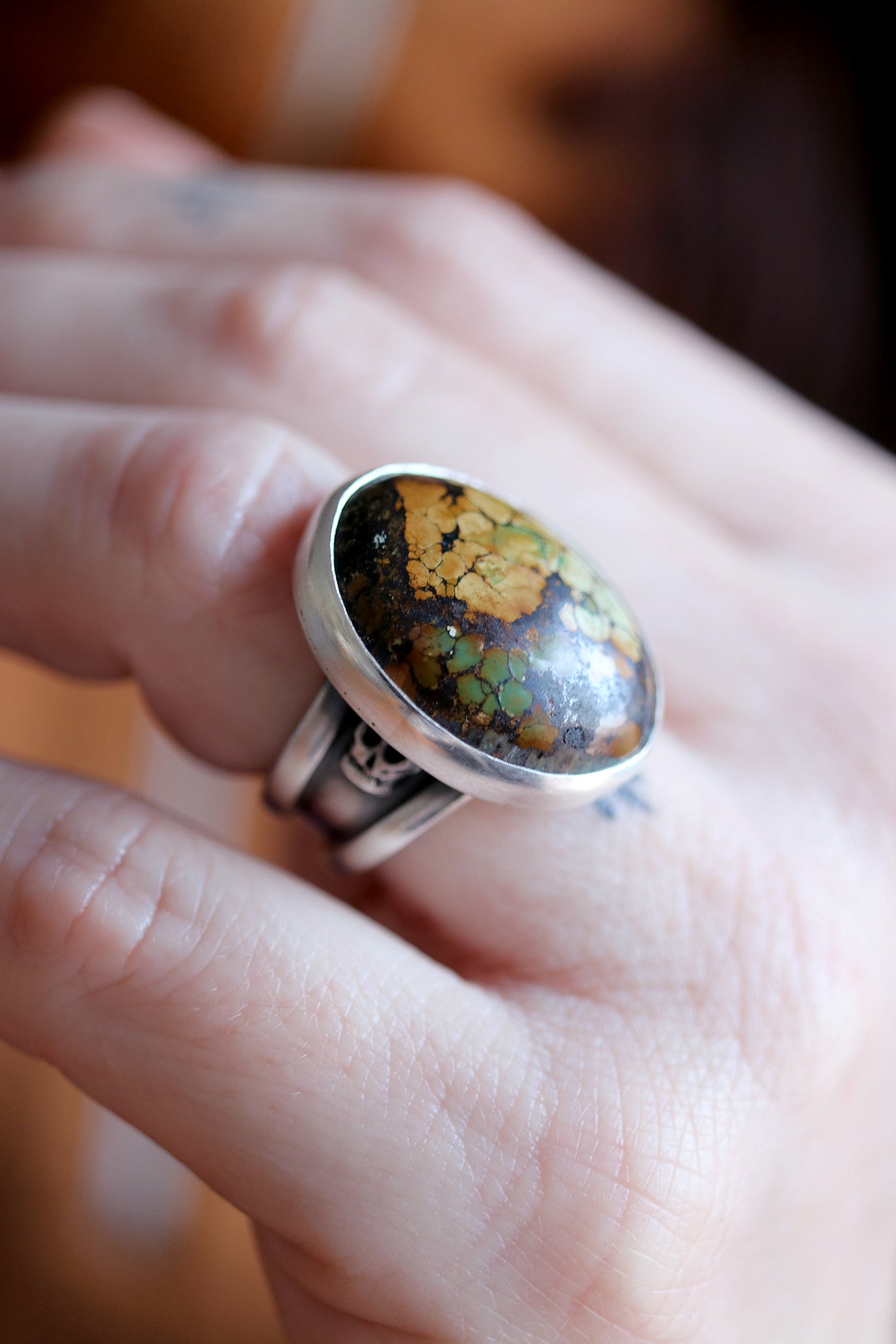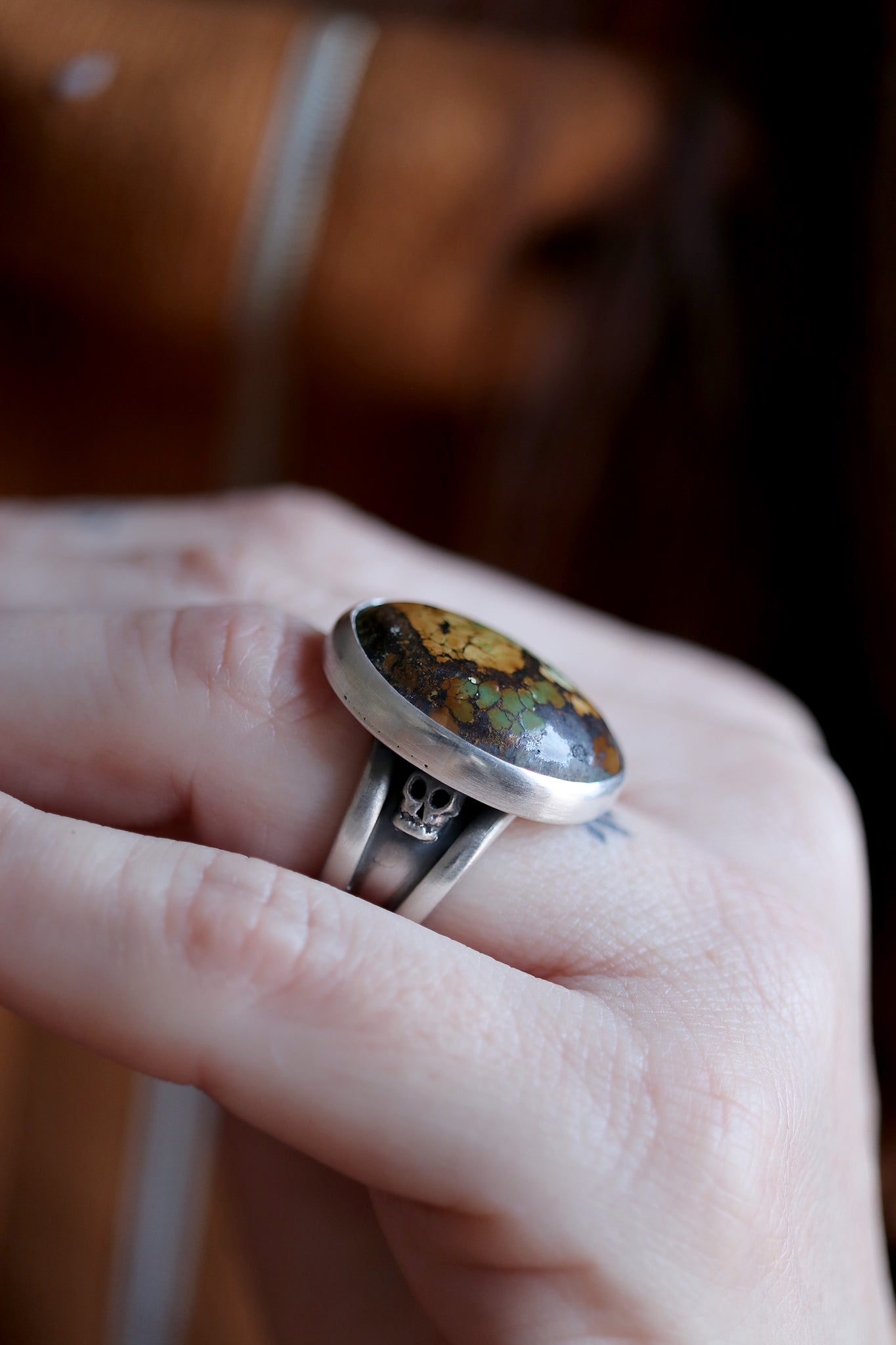 It's set in a simple sterling silver setting with a wide band with a skull on each side.
