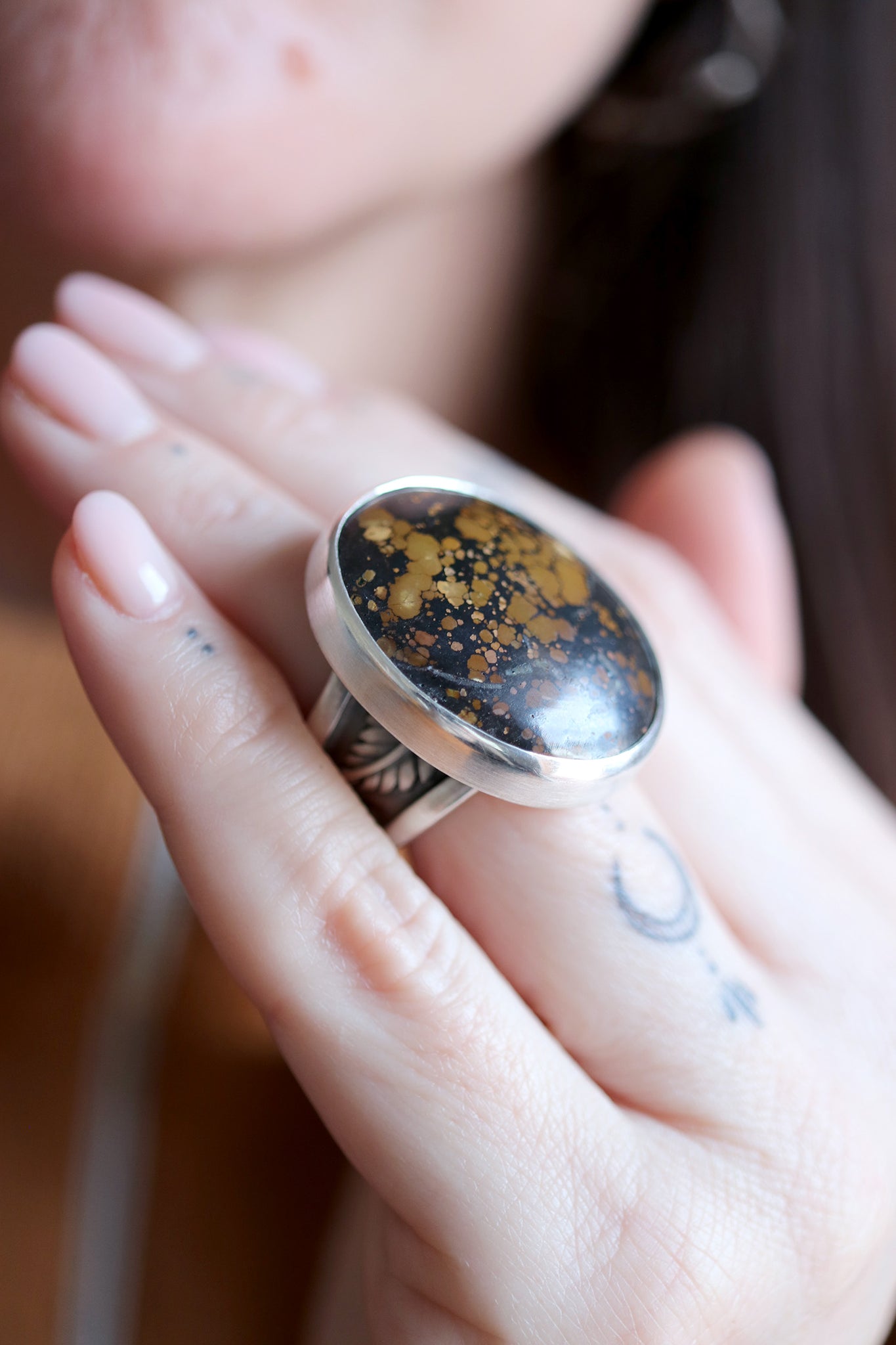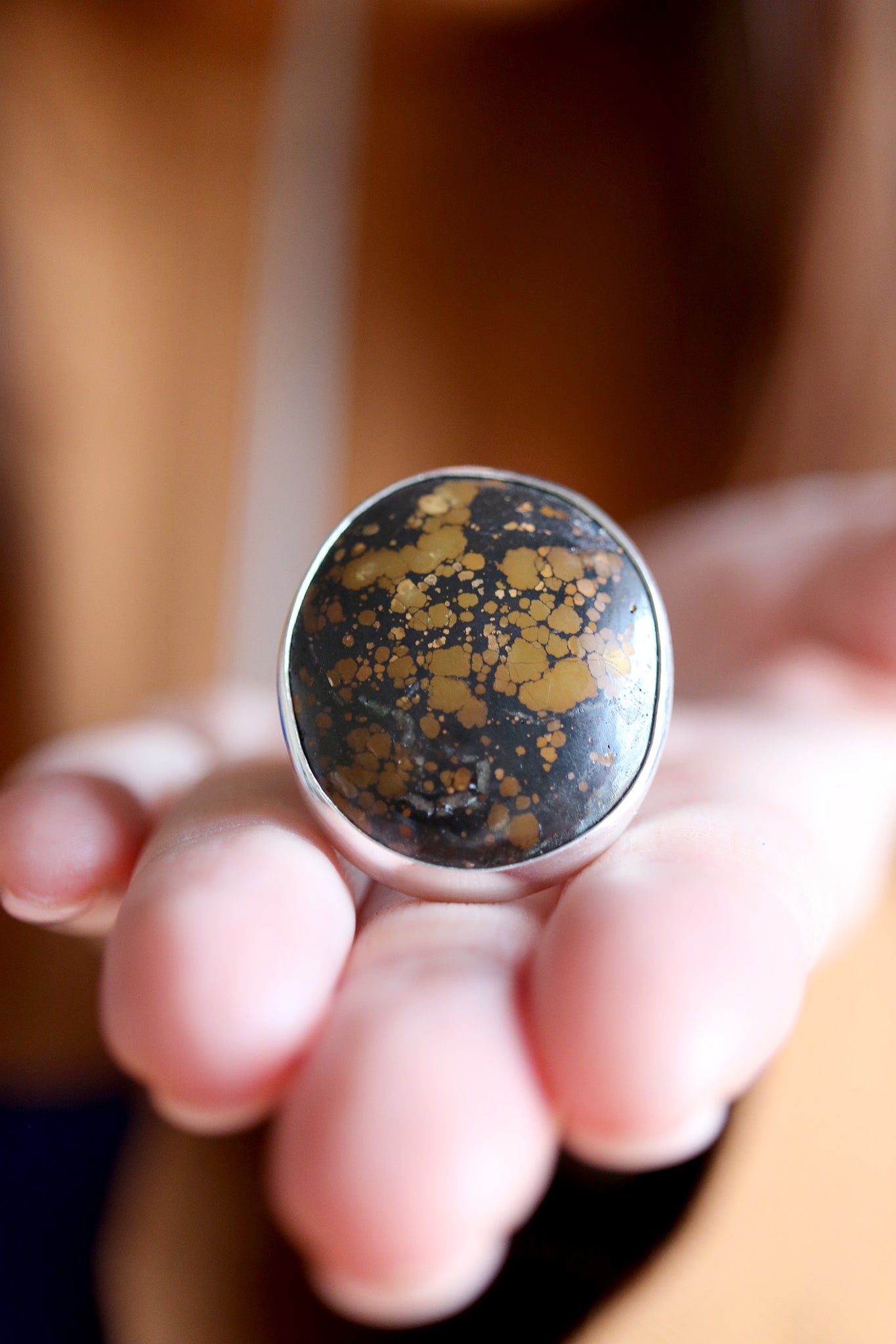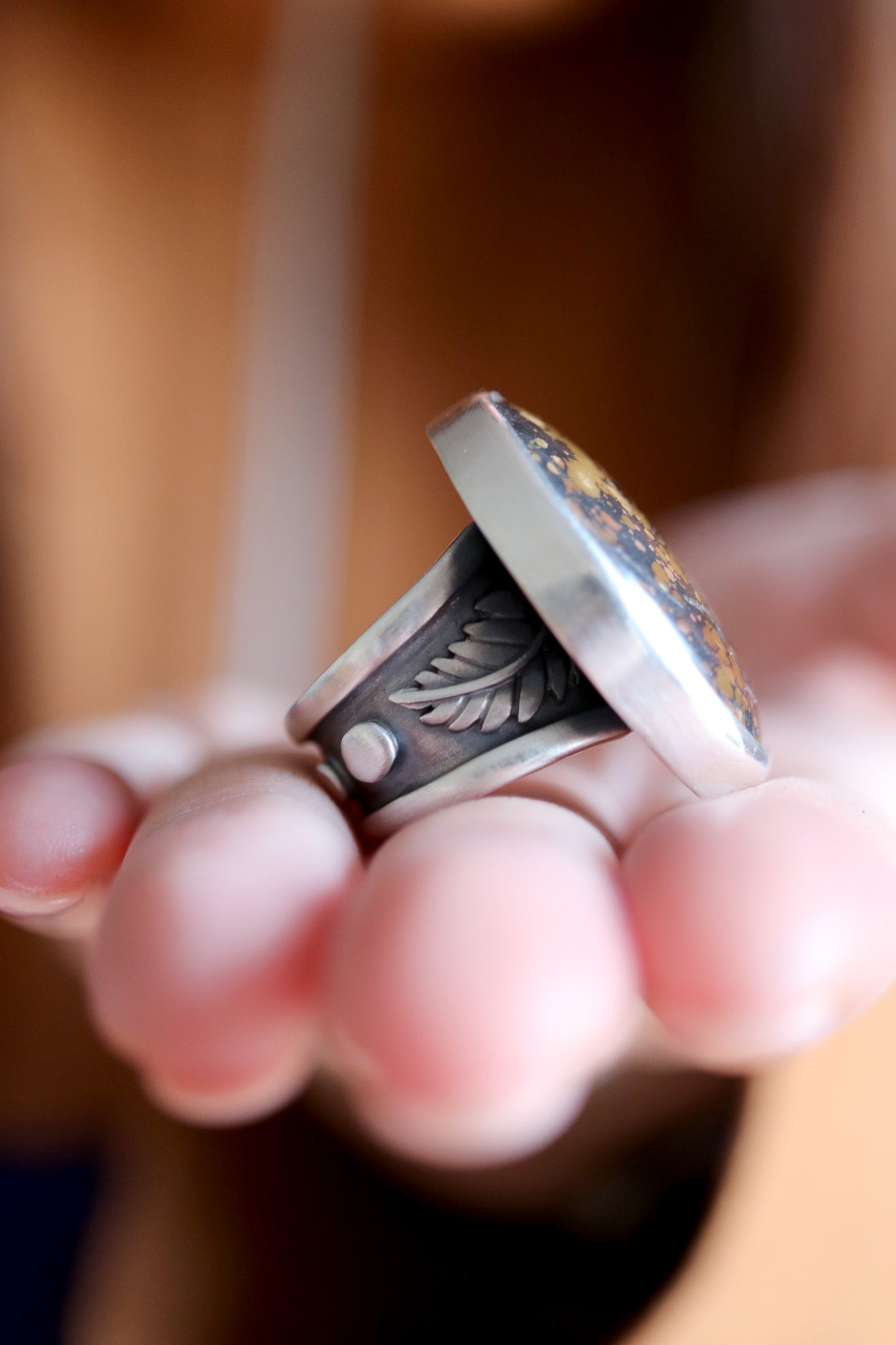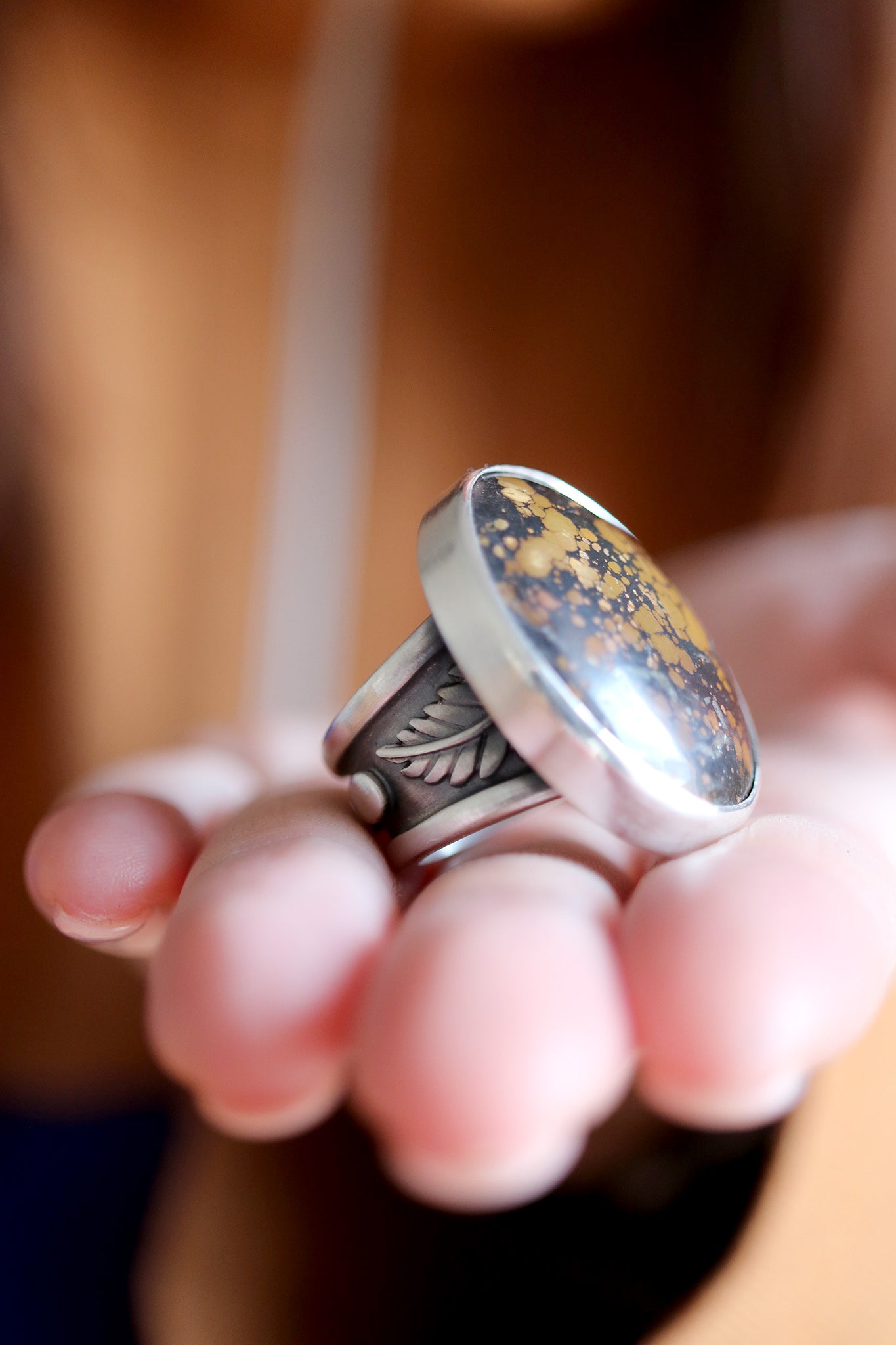 It's set in a simple sterling silver setting with a wide band with leaves and balls on each side.