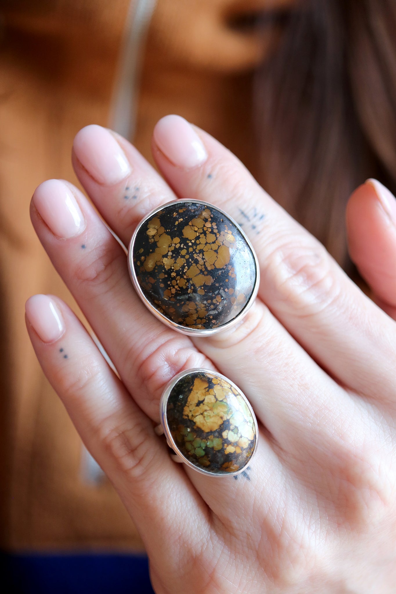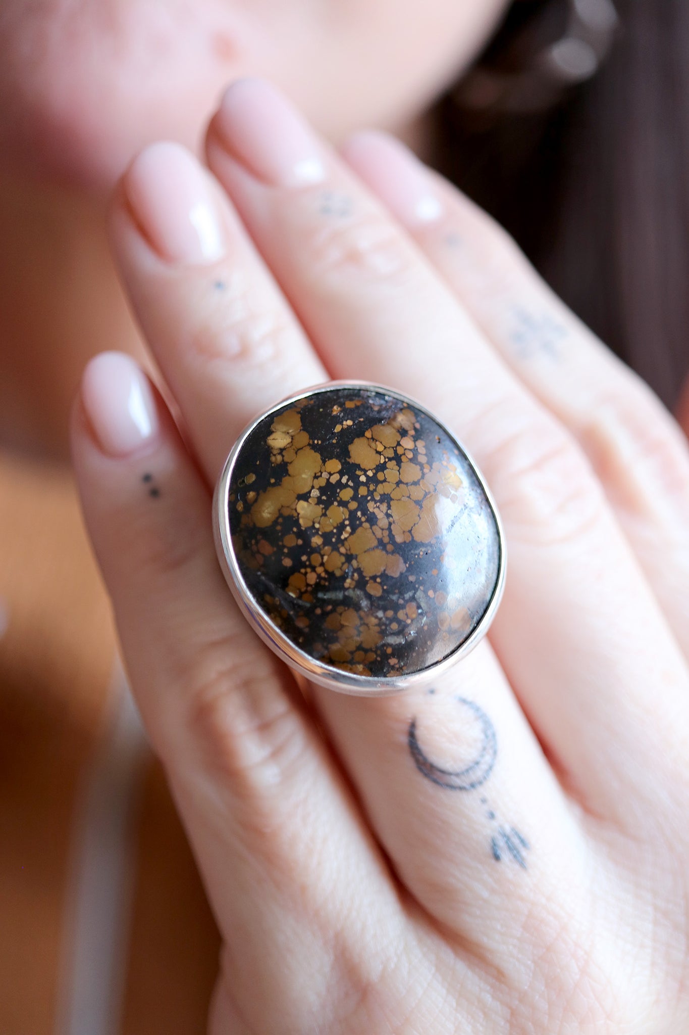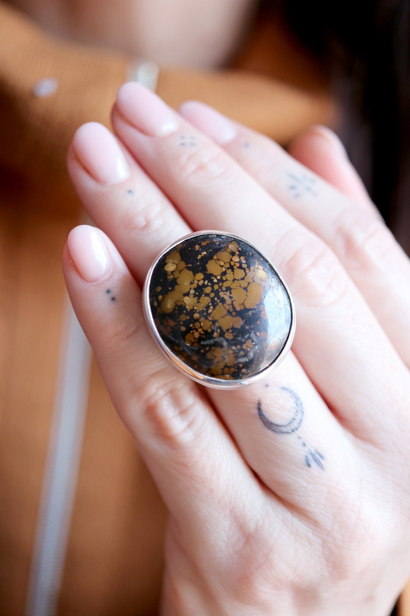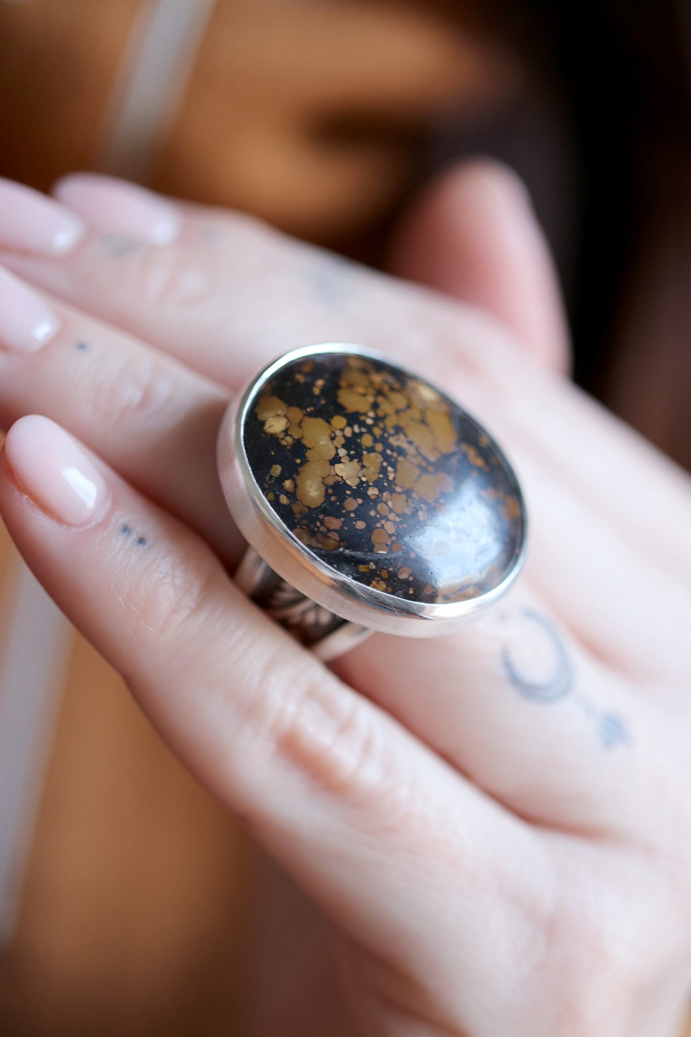 It's set in a simple sterling silver setting with a wide band with leaves and balls on each side.